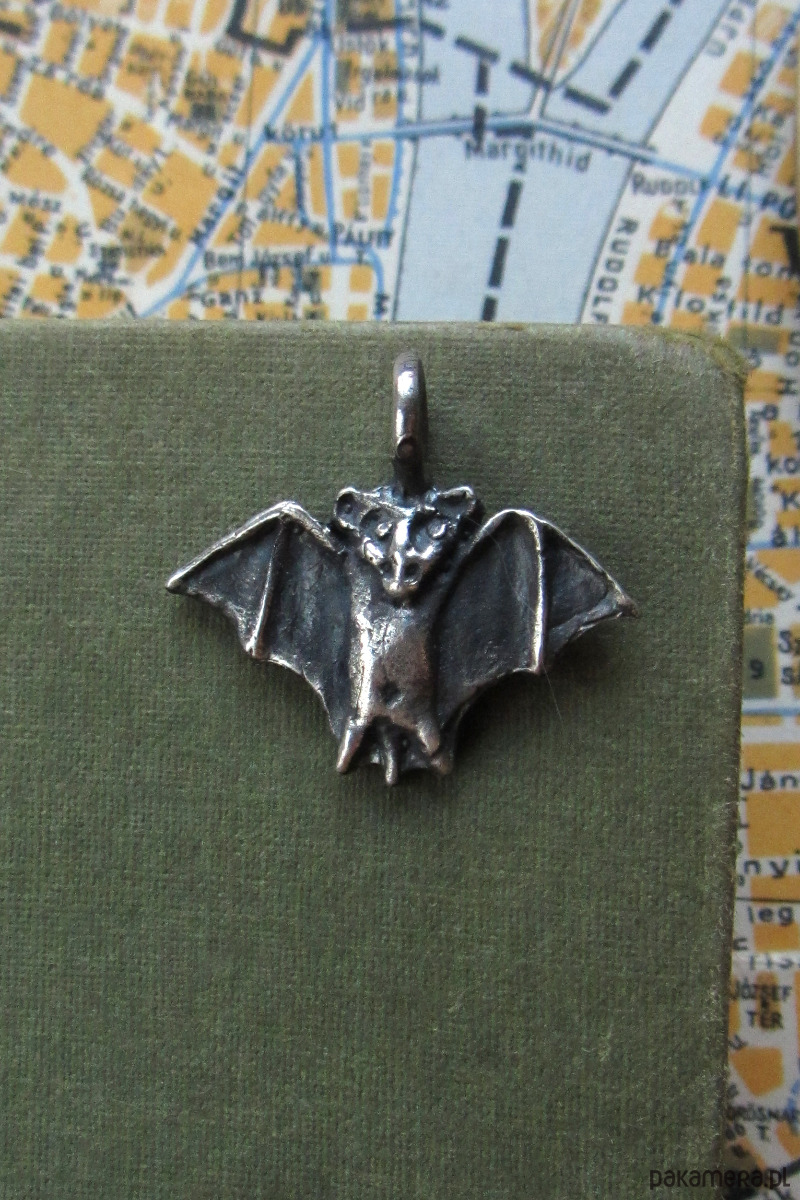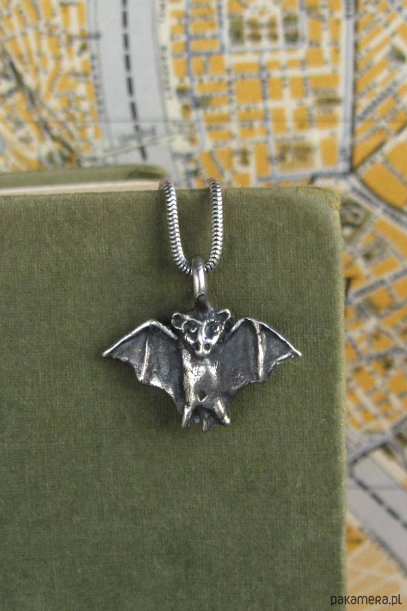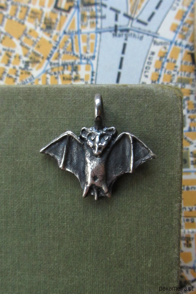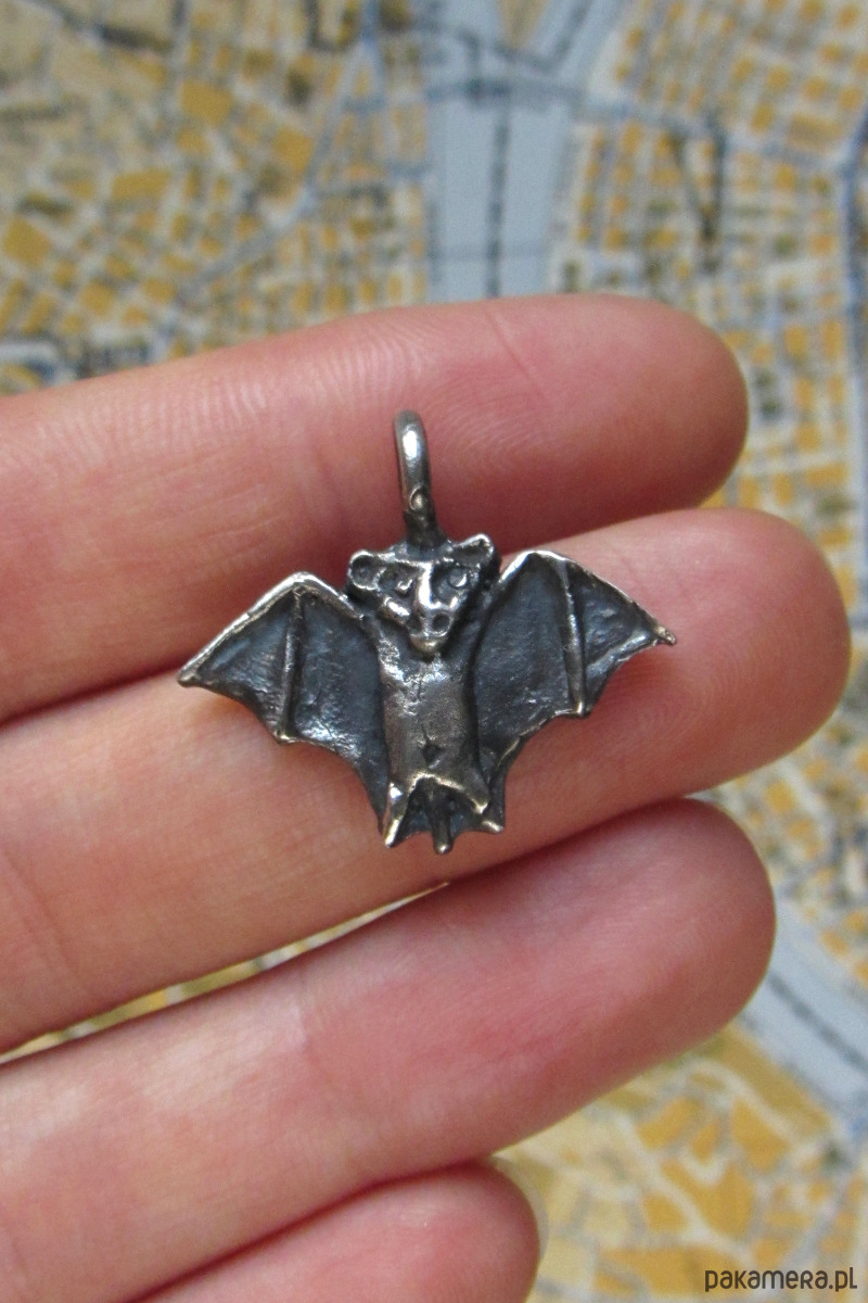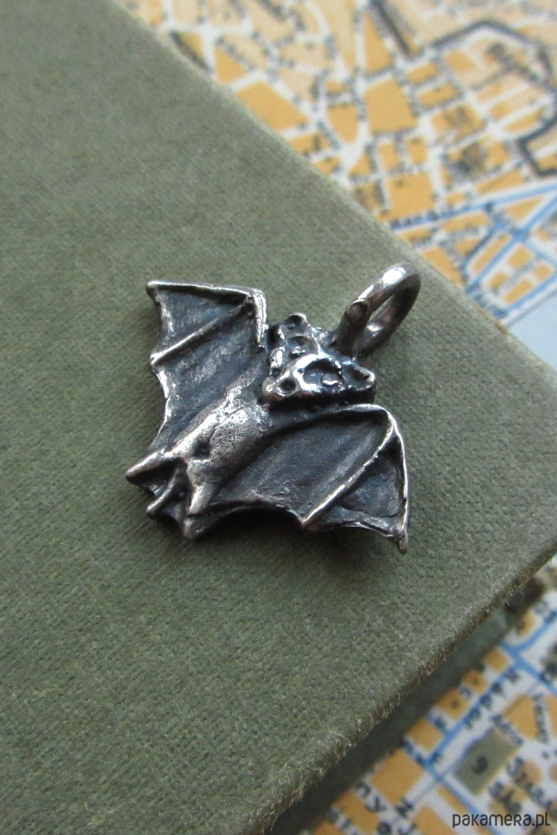 Ręcznie rzeźbiona zawieszka przedstawiająca nietoperza inspirowana średniowiecznymi manuskryptami. Zawieszka wykonana od podstaw metodą wosku traconego ze srebra w krakowskiej pracowni oraz patynowana.