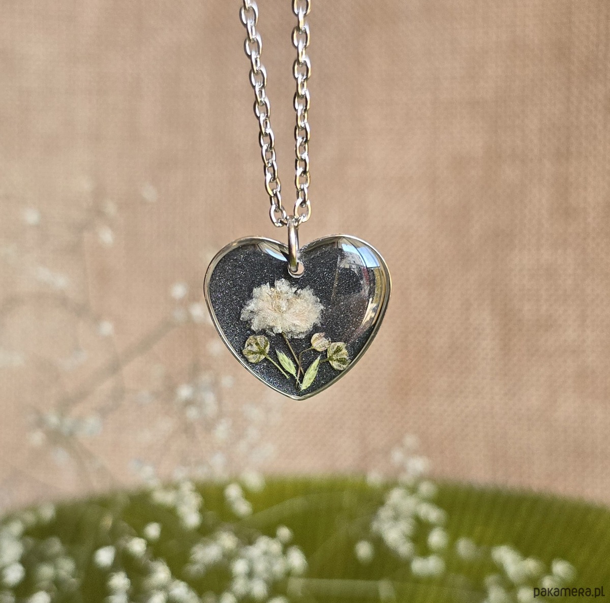 Oferuję Państwu unikalną biżuterię. Zawieszka jest wykonana z suszonych kwiatów i żywicy epoksydowej. Biżuteria jest wspaniałym i oryginalnym prezentem na lata.