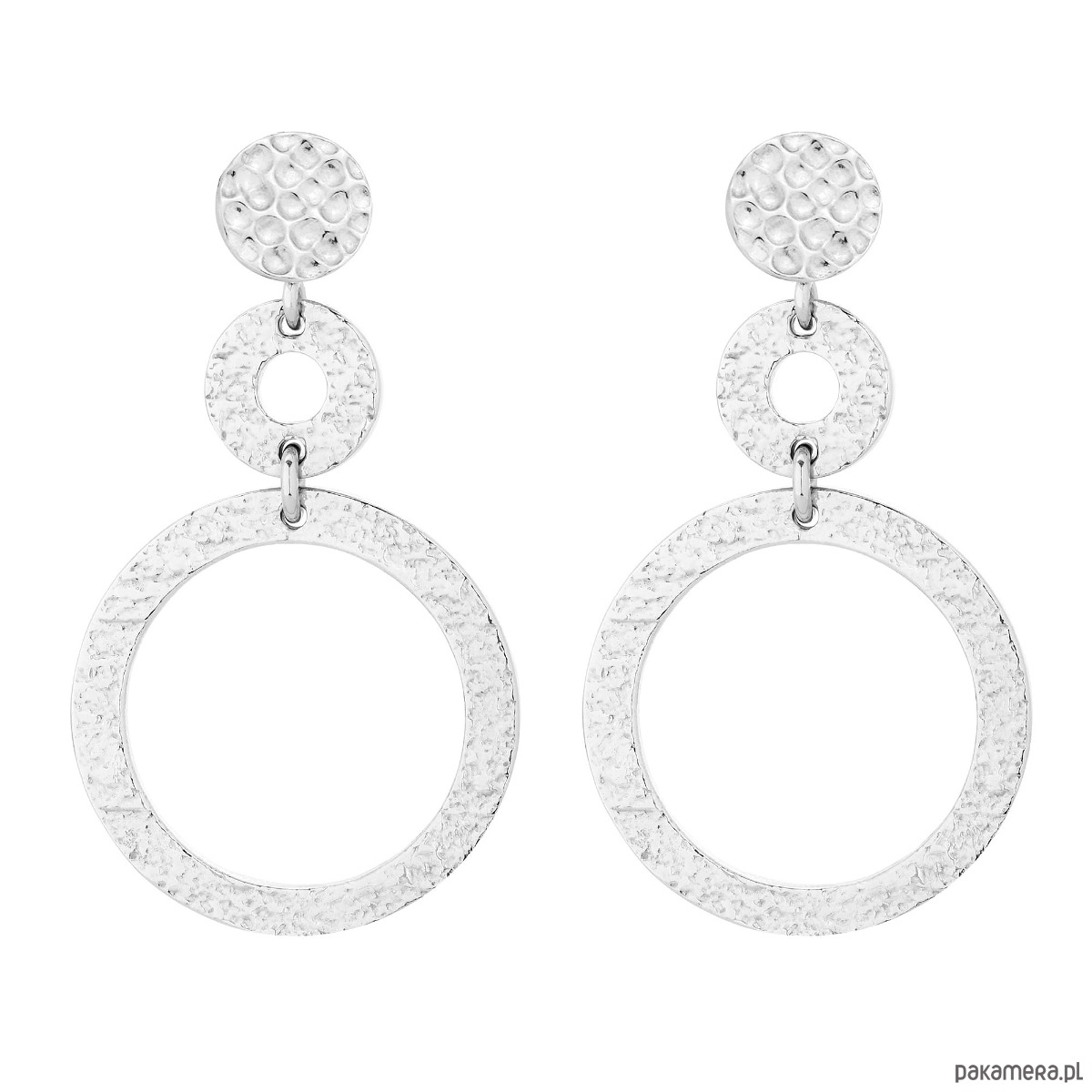Srebrne długie kolczyki z chropowatymi obręczami. Zapinane na sztyft. Kolczyki posiadają zapięcia (baranki). Całość wykonana ze srebra 925.