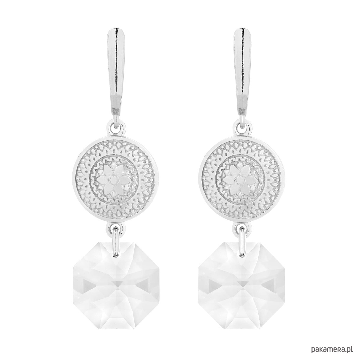 Srebrne kolczyki wykonane z medalionów i kryształów SWAROVSKI® CRYSTAL w kolorze Crystal. Całość wykonana ze srebra 925. Zapinane na bigle angielskie.