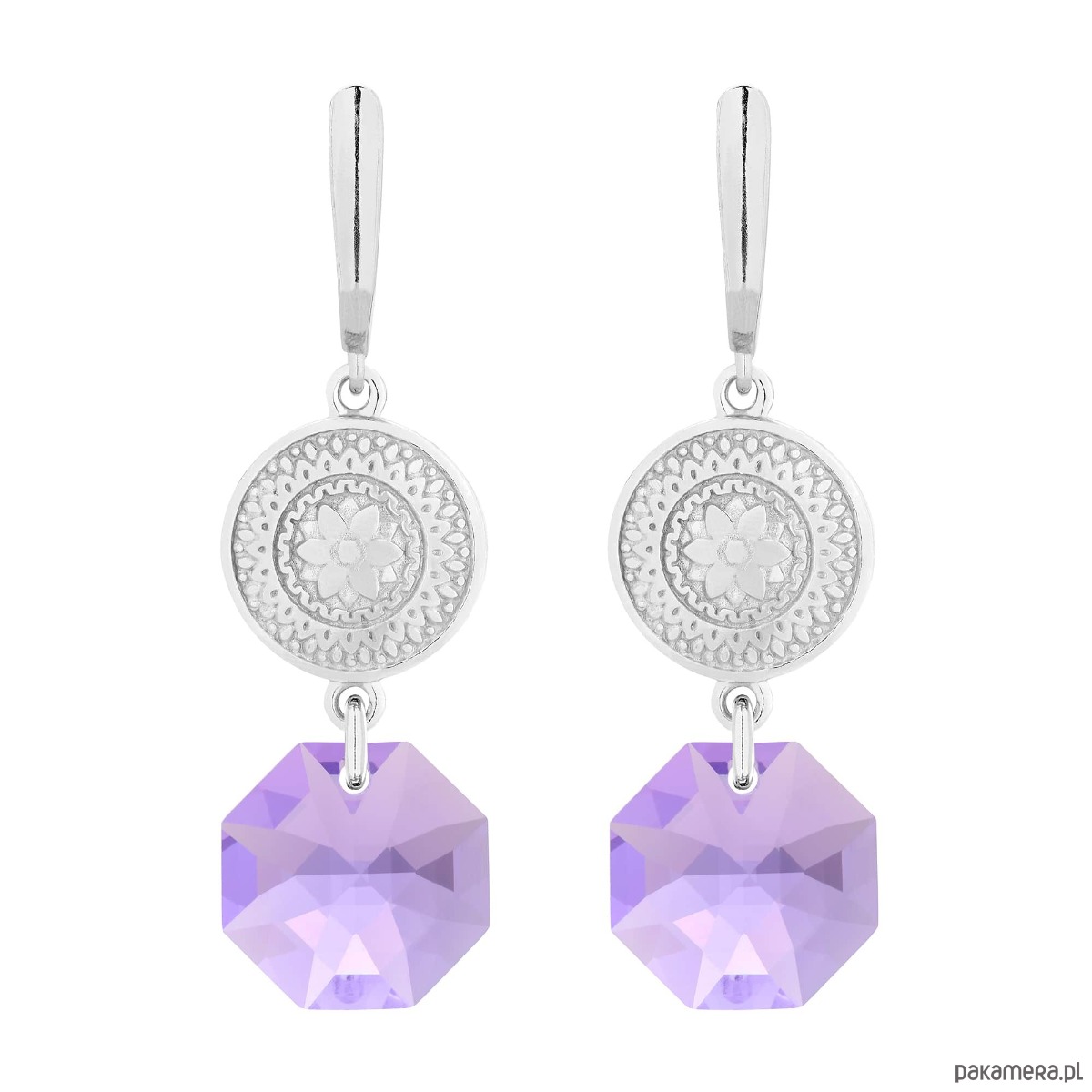 Srebrne kolczyki wykonane z medalionów i kryształów SWAROVSKI® CRYSTAL w kolorze Violet. Całość wykonana ze srebra 925. Zapinane na bigle angielskie.
