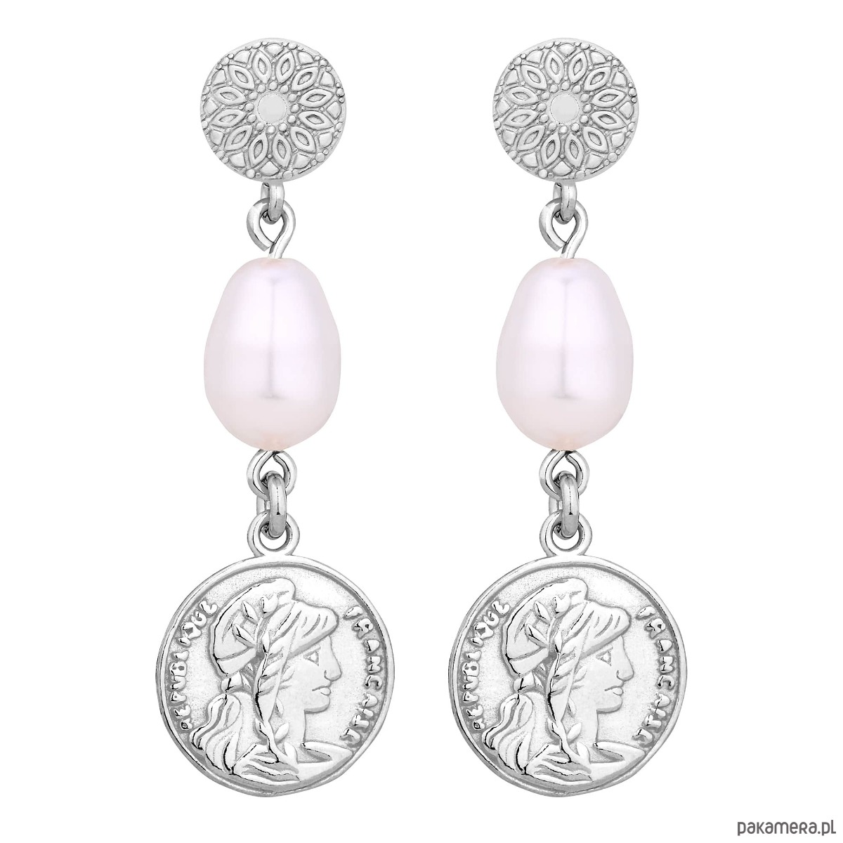 Srebrne kolczyki wykonane z monet i pereł SWAROVSKI® CRYSTAL w kolorze White. Całość wykonana ze srebra 925. Zapinane na sztyfty.