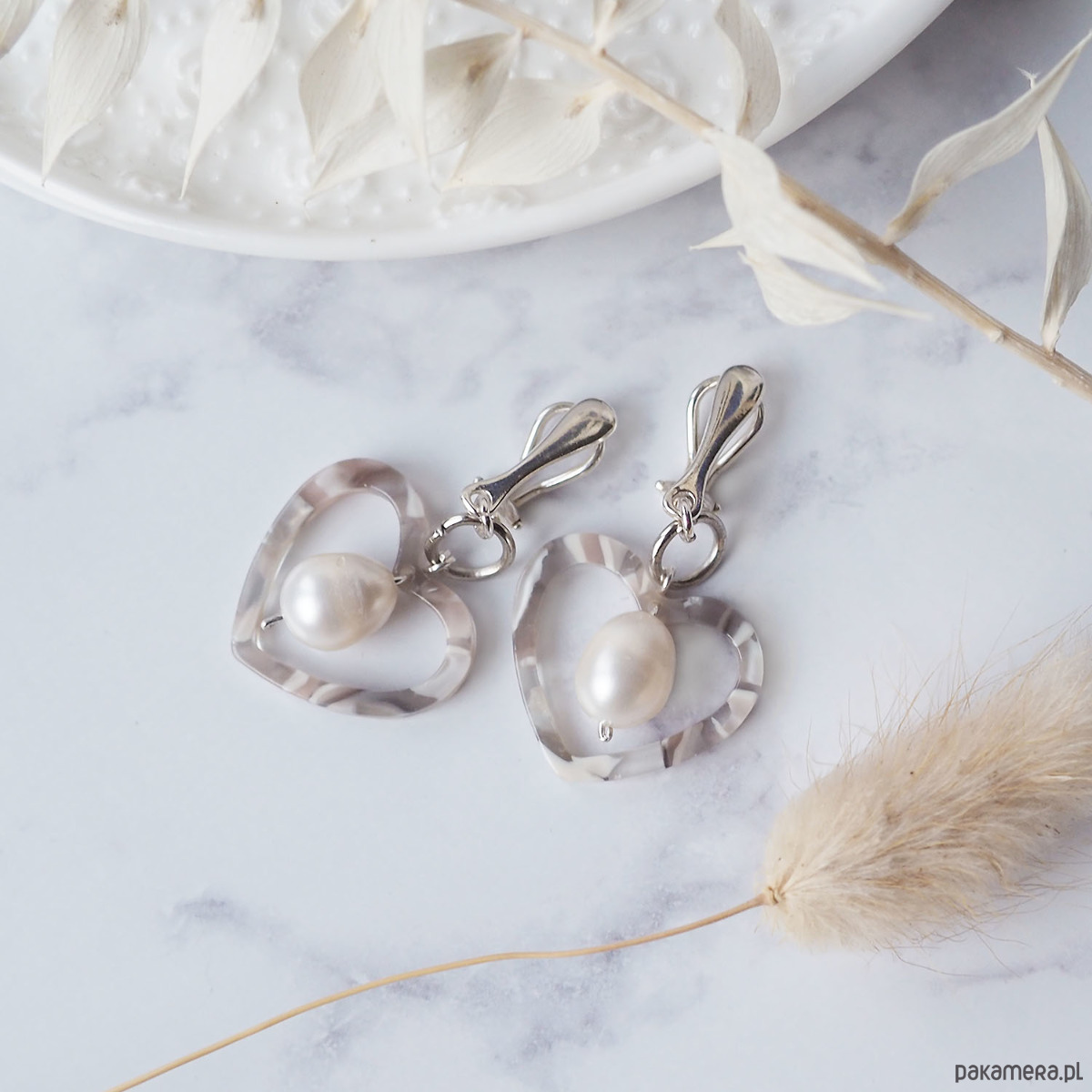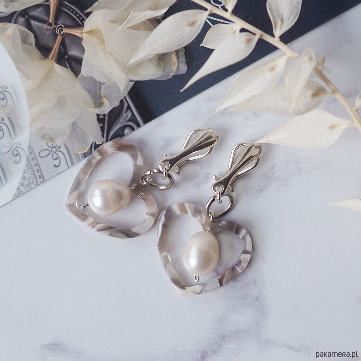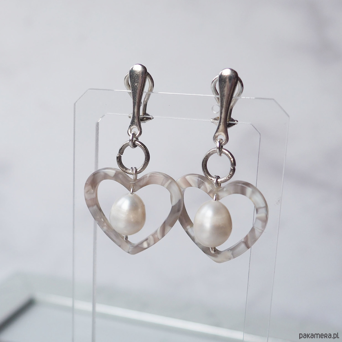 SREBRNE KLIPSY wiszące z serduszkami i perłami