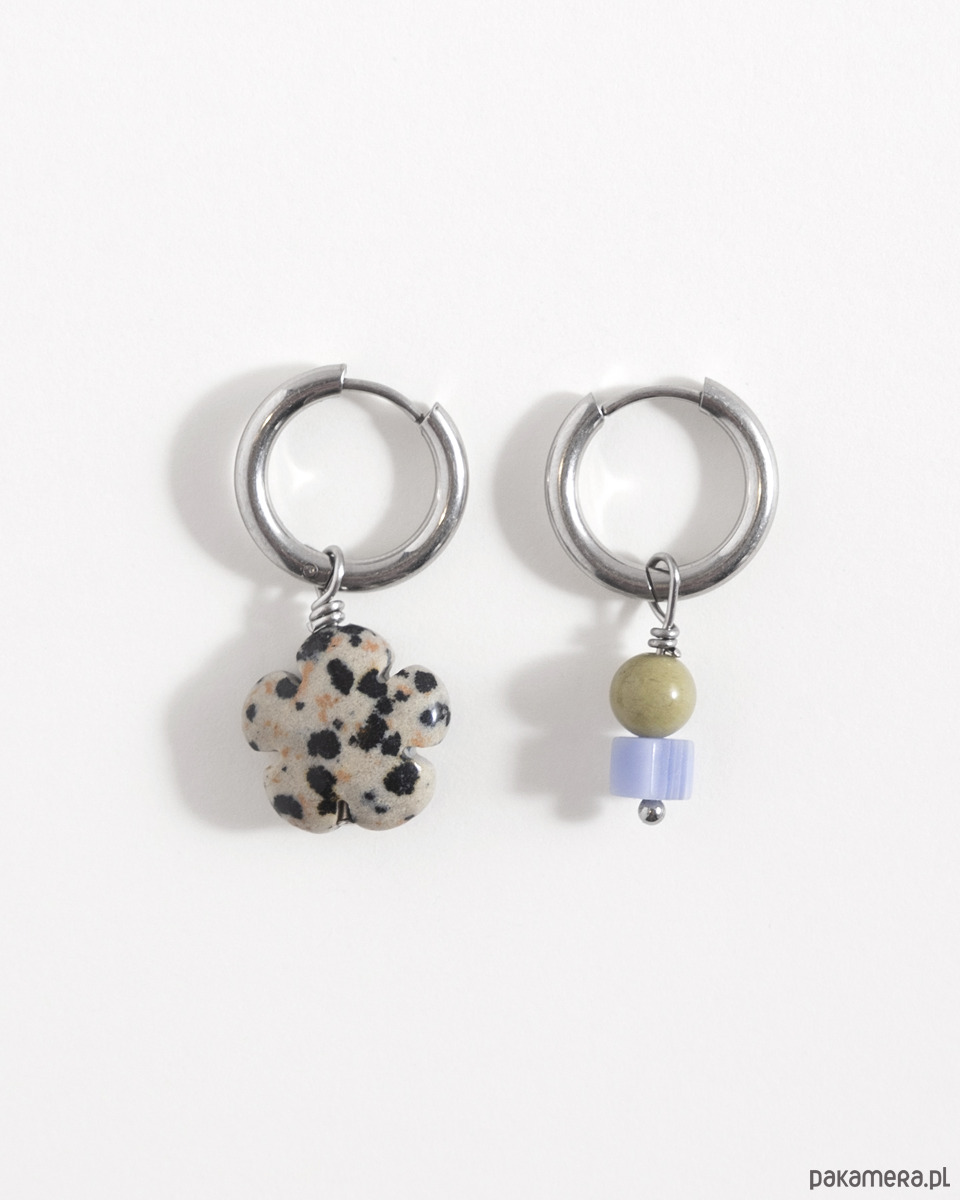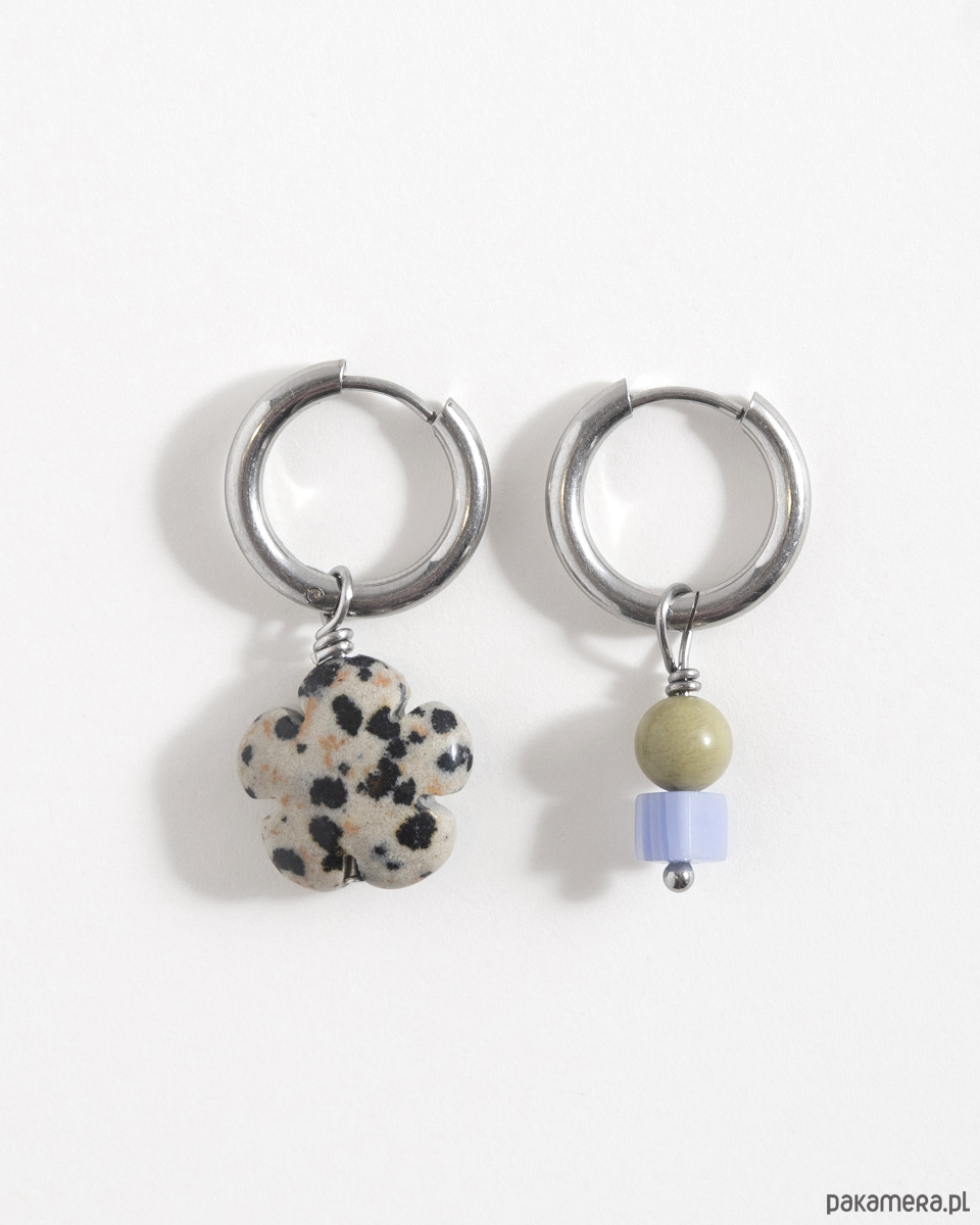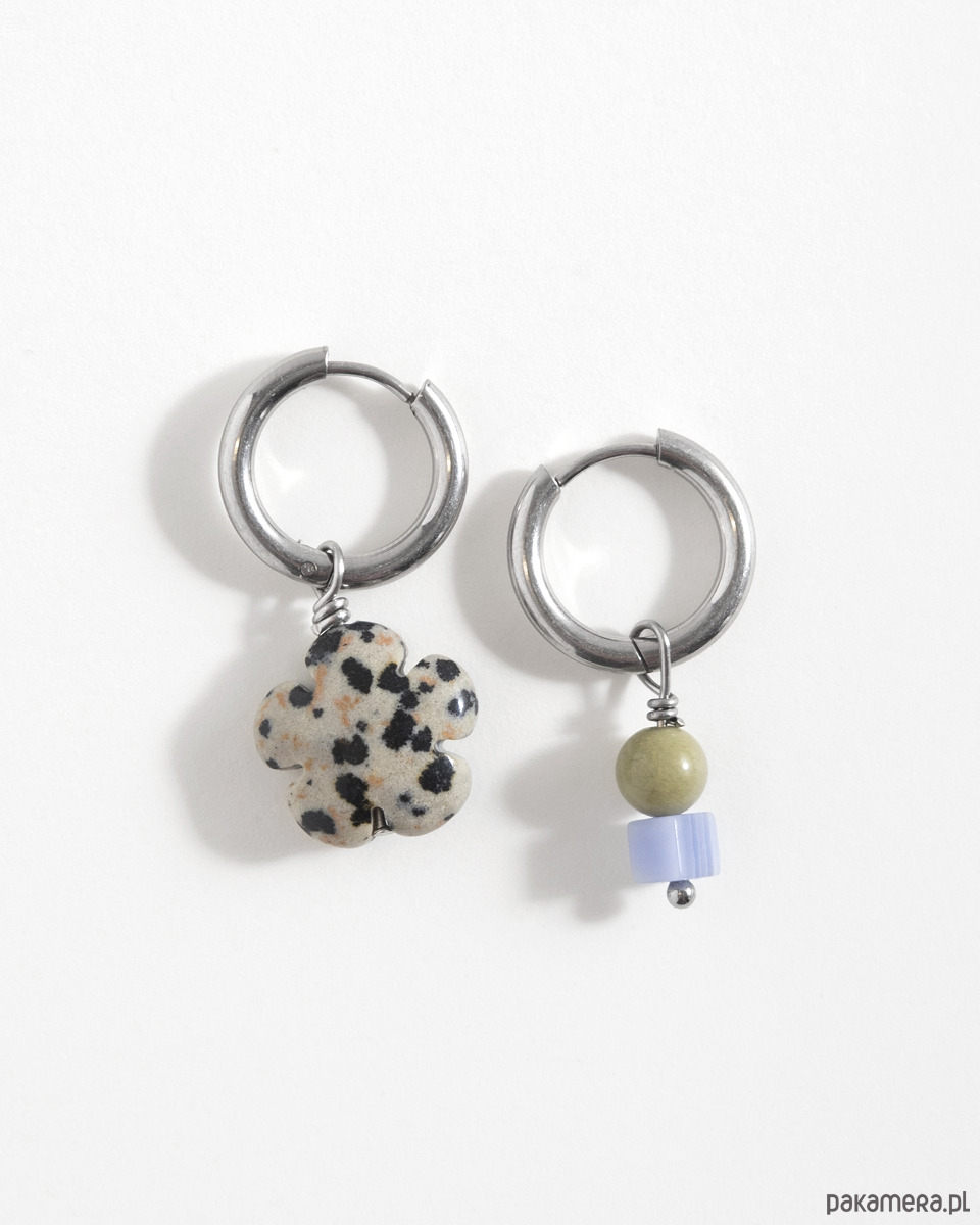 Kolczyki w kształcie kół wykonano ze stali chirurgicznej. Zdobione są zawieszkami z naturalnych kamieni – kwiatkiem z jaspisu dalmatyńskiego oraz drugą zawieszką z agatu i jaspisu.