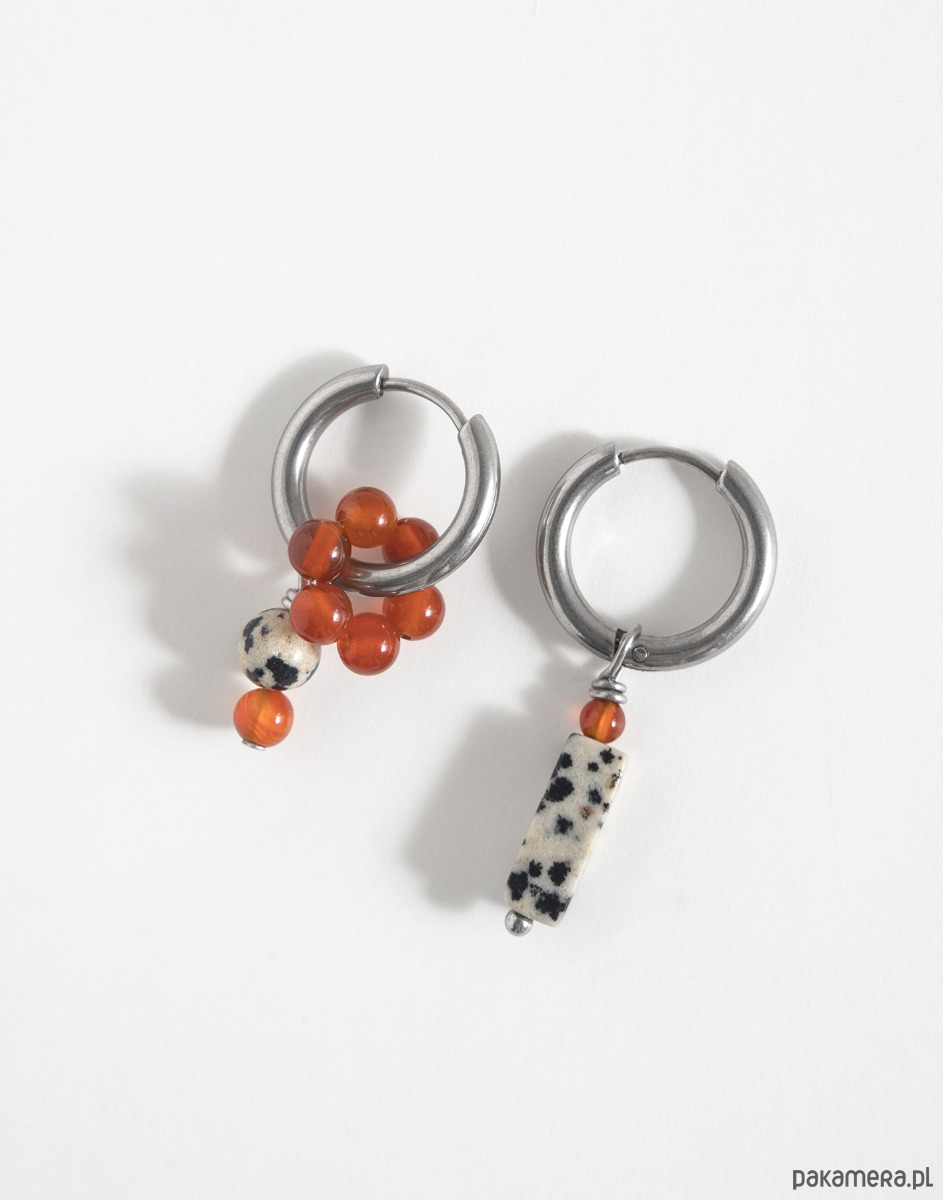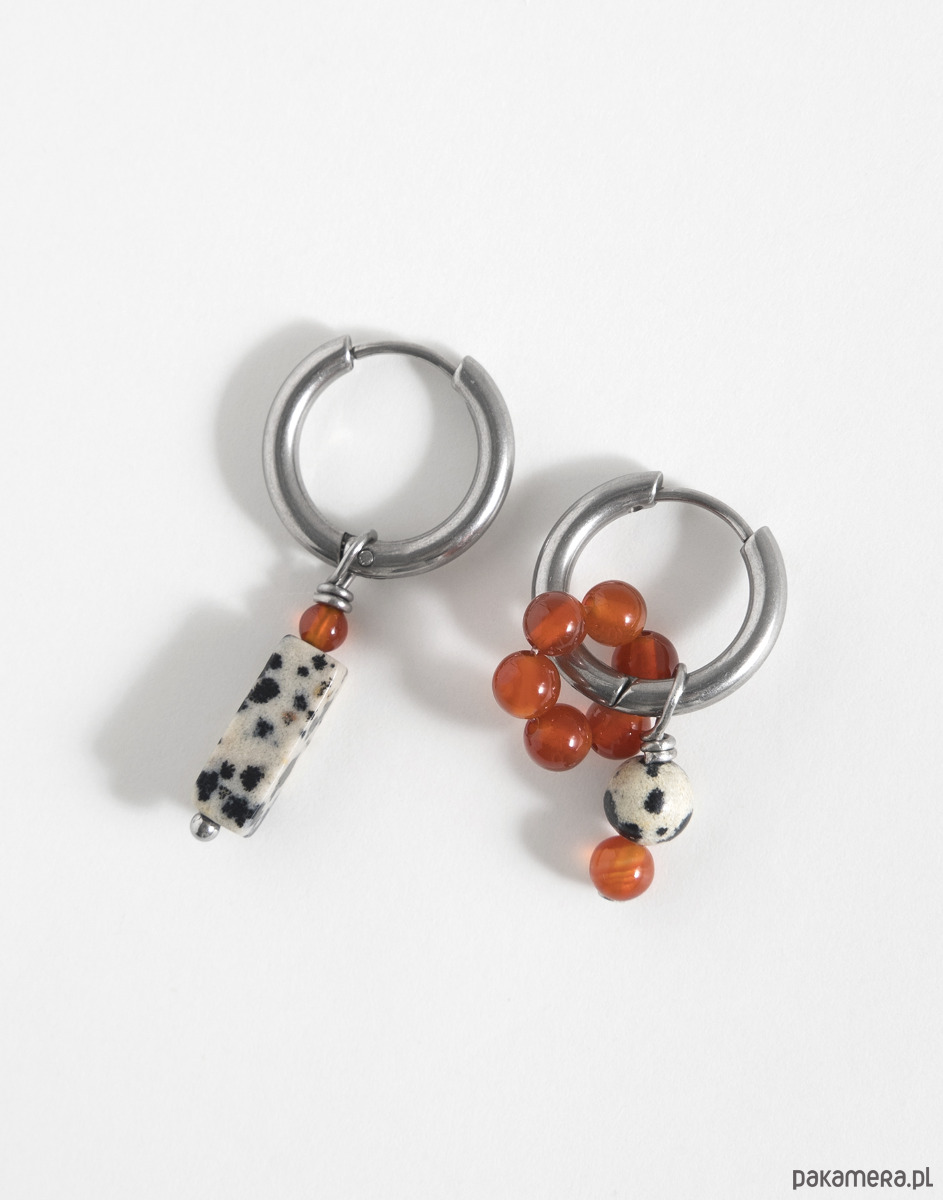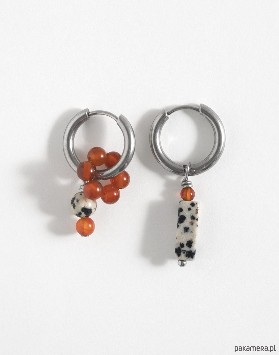 Kolczyki wykonano ze stali chirurgicznej. Zestaw zawiera trzy wymienne zawieszki: kwiatka z agatu oraz zawieszki z jaspisu dalmatyńskiego i agatu. Zawieszki można nosić razem, pojedynczo lub całkowicie je odpiąć, pozostawiając same kolczyki. Świetnie sprawdzą się też jako element naszyjnika – można je dowolnie komponować w zależności od stylizacji.