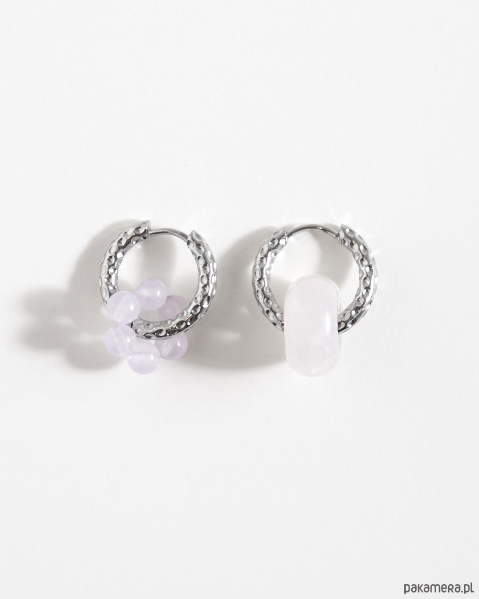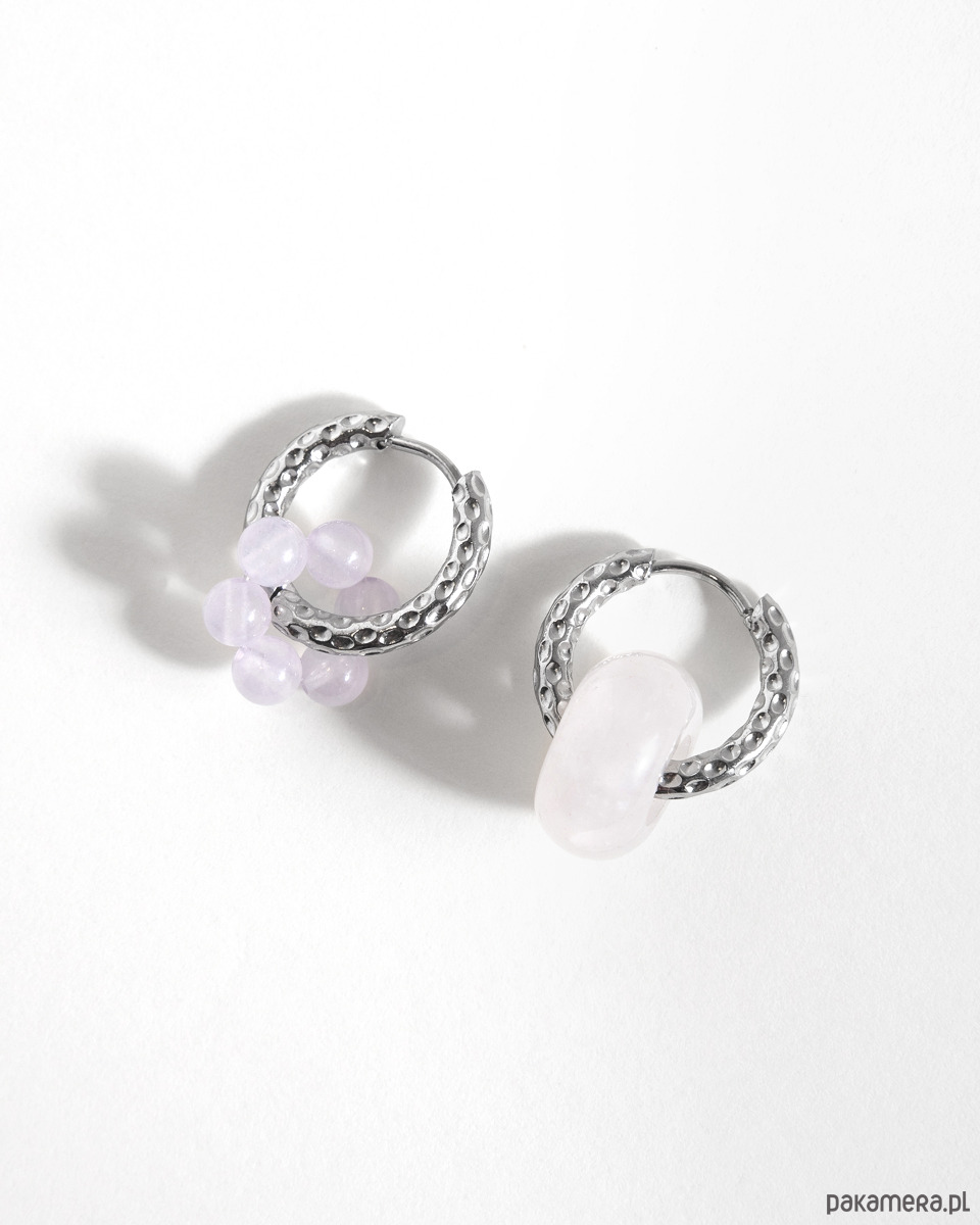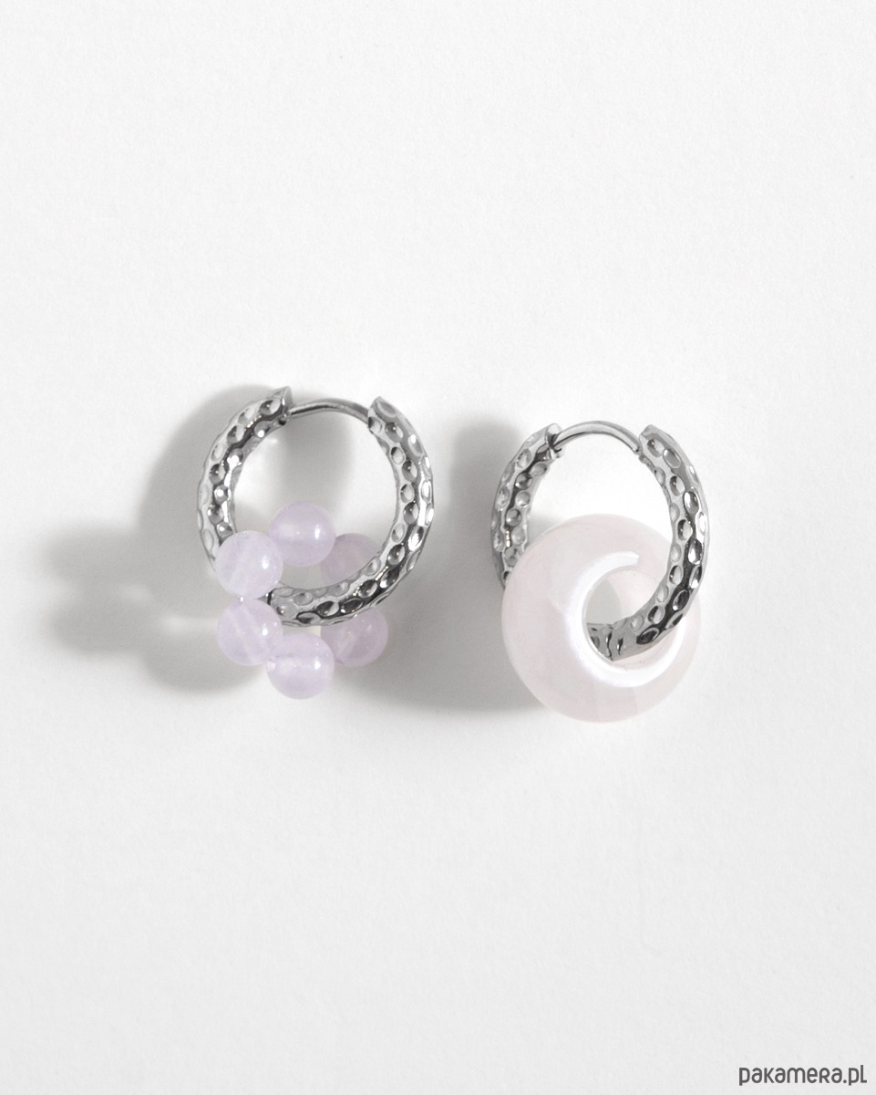 Kolczyki wykonano ze stali chirurgicznej. Zdobione są zawieszkami z naturalnych kamieni – oponką z kwarcu różowego i kwiatkiem z jadeitu. Zawieszki można nosić razem, pojedynczo lub całkowicie je odpiąć, pozostawiając same kolczyki.