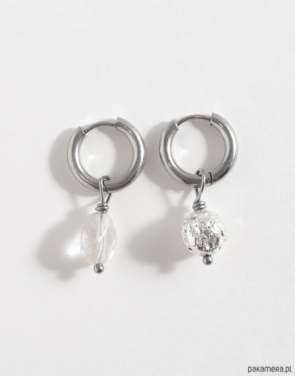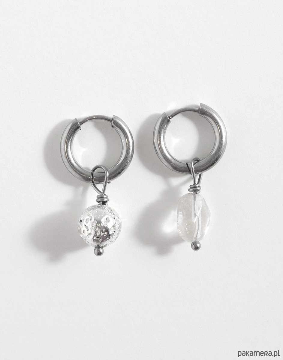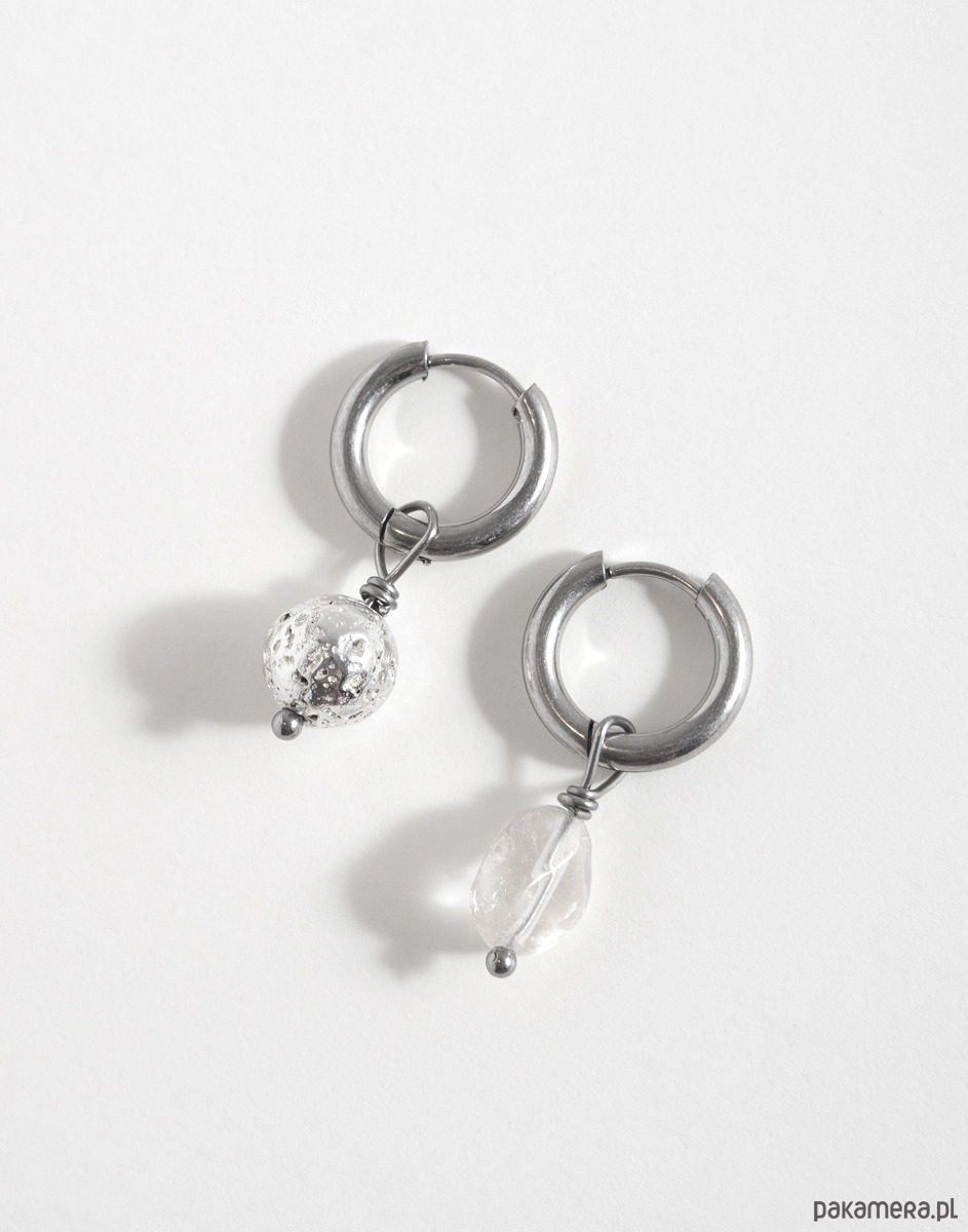 Kolczyki w kształcie kół wykonano ze stali chirurgicznej. Zdobione są zawieszkami z naturalnych kamieni – z kryształu górskiego oraz lawy wulkanicznej.
