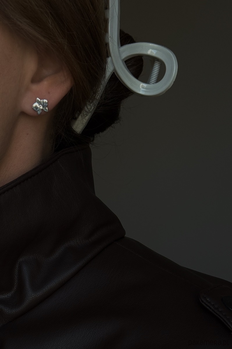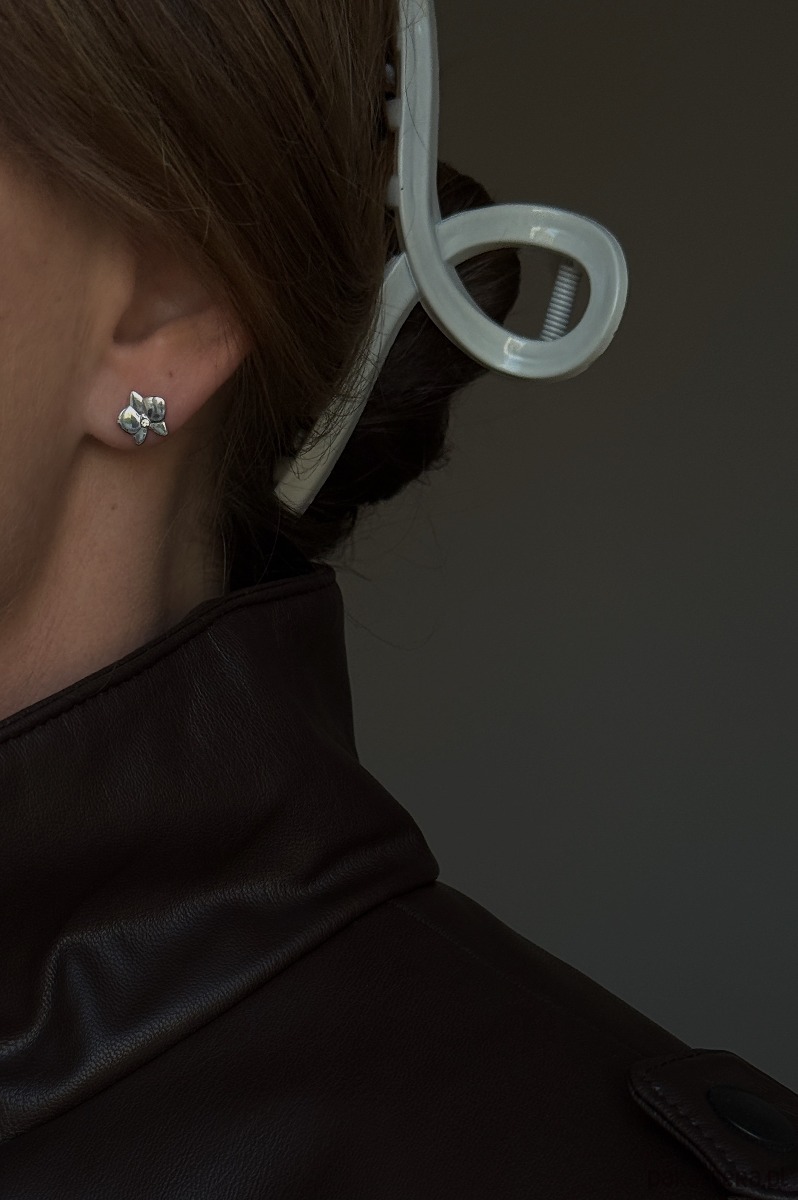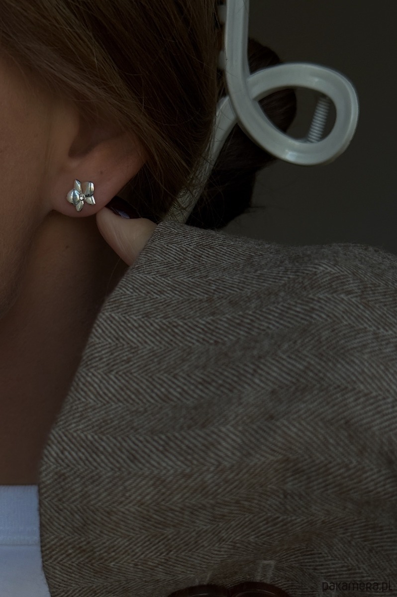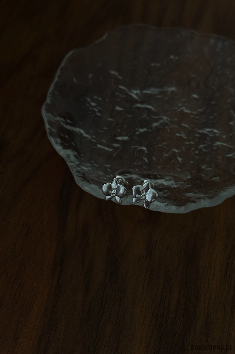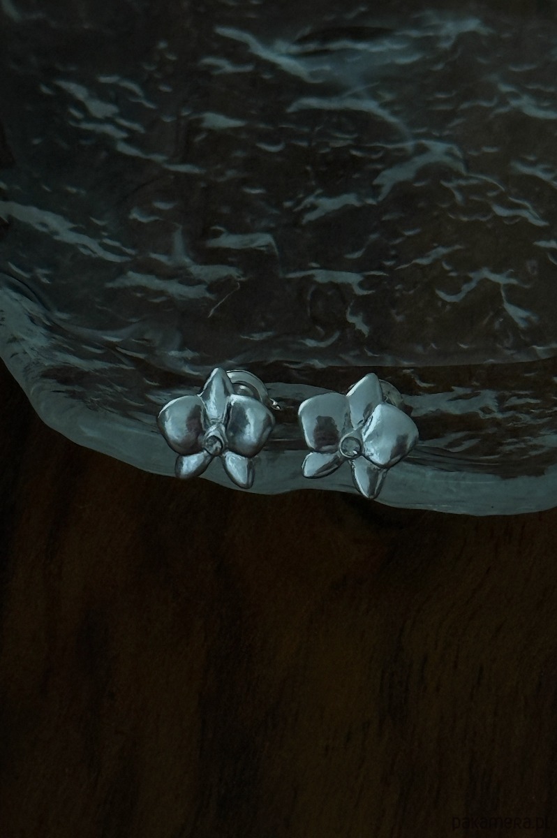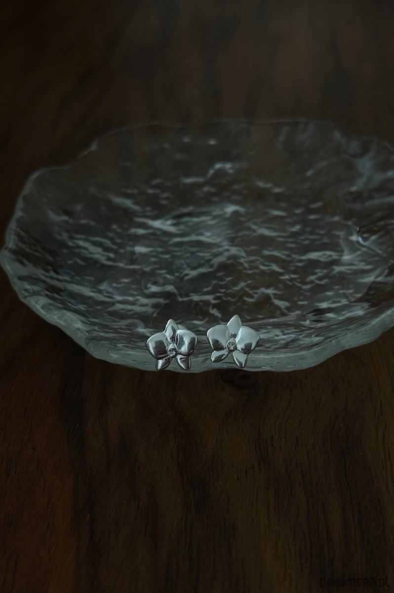 Srebrne kolczyki orchidee z bezbarwnymi kryształkami Preciosa. Całość wykonana ze srebra 925. Zapinane na sztyft. Kolczyki posiadają zapięcia (baranki).
