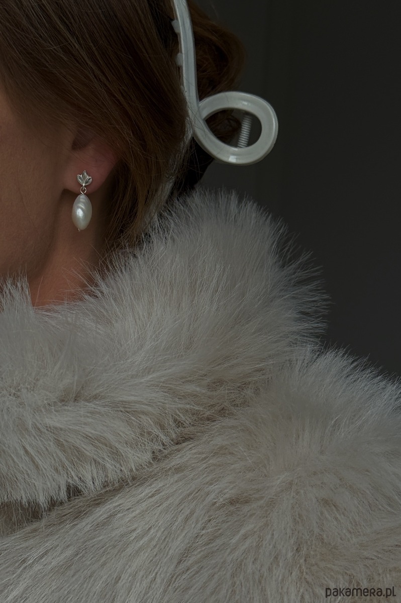 Srebrne kolczyki listki z naturalnymi nieregularnymi perłami. Całość wykonana ze srebra 925. Zapinane na sztyft. Kolczyki posiadają zapięcia (baranki).