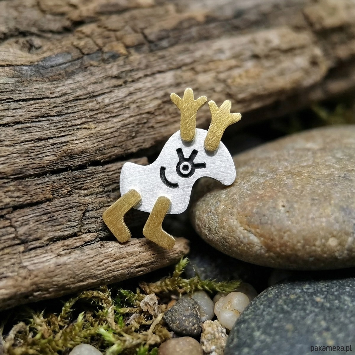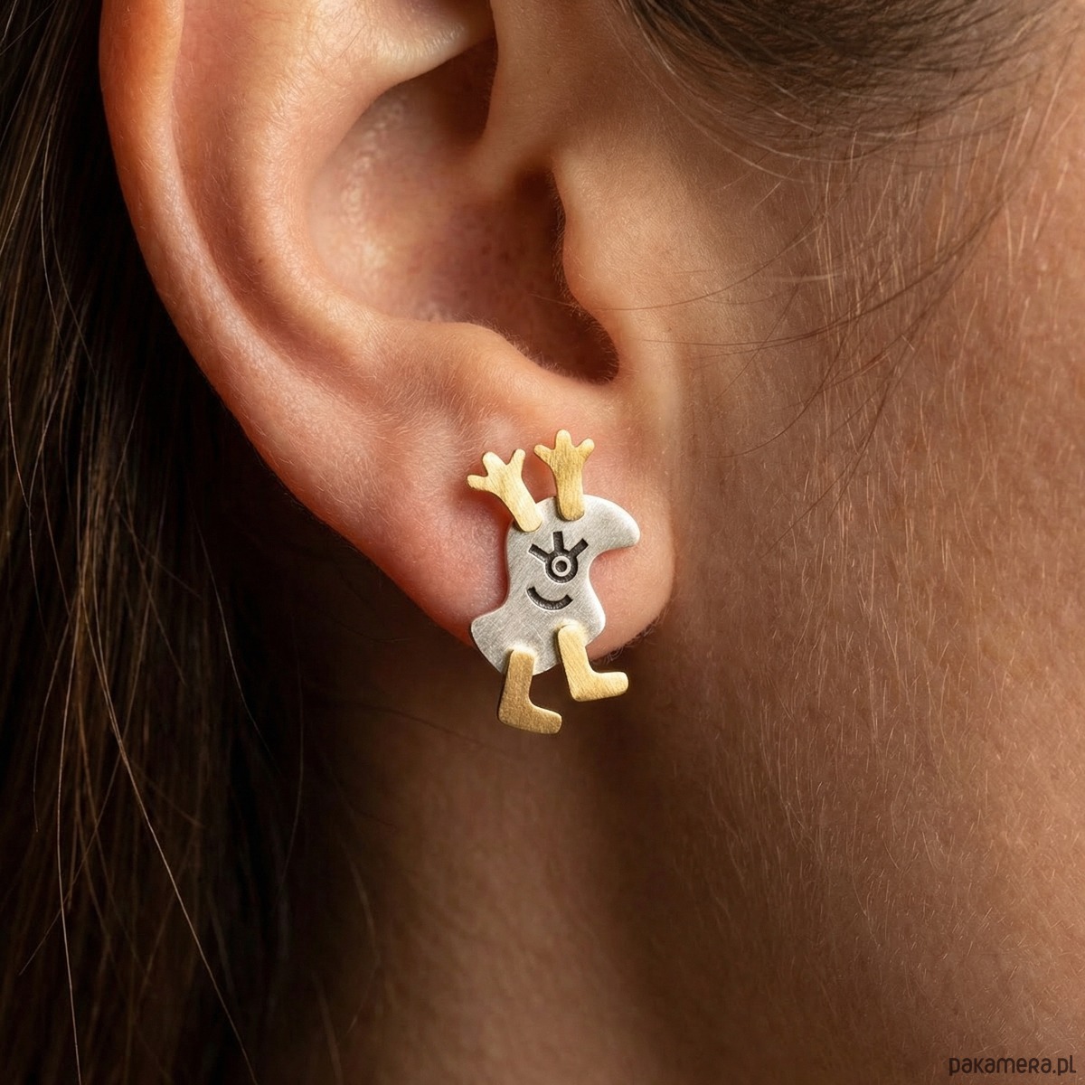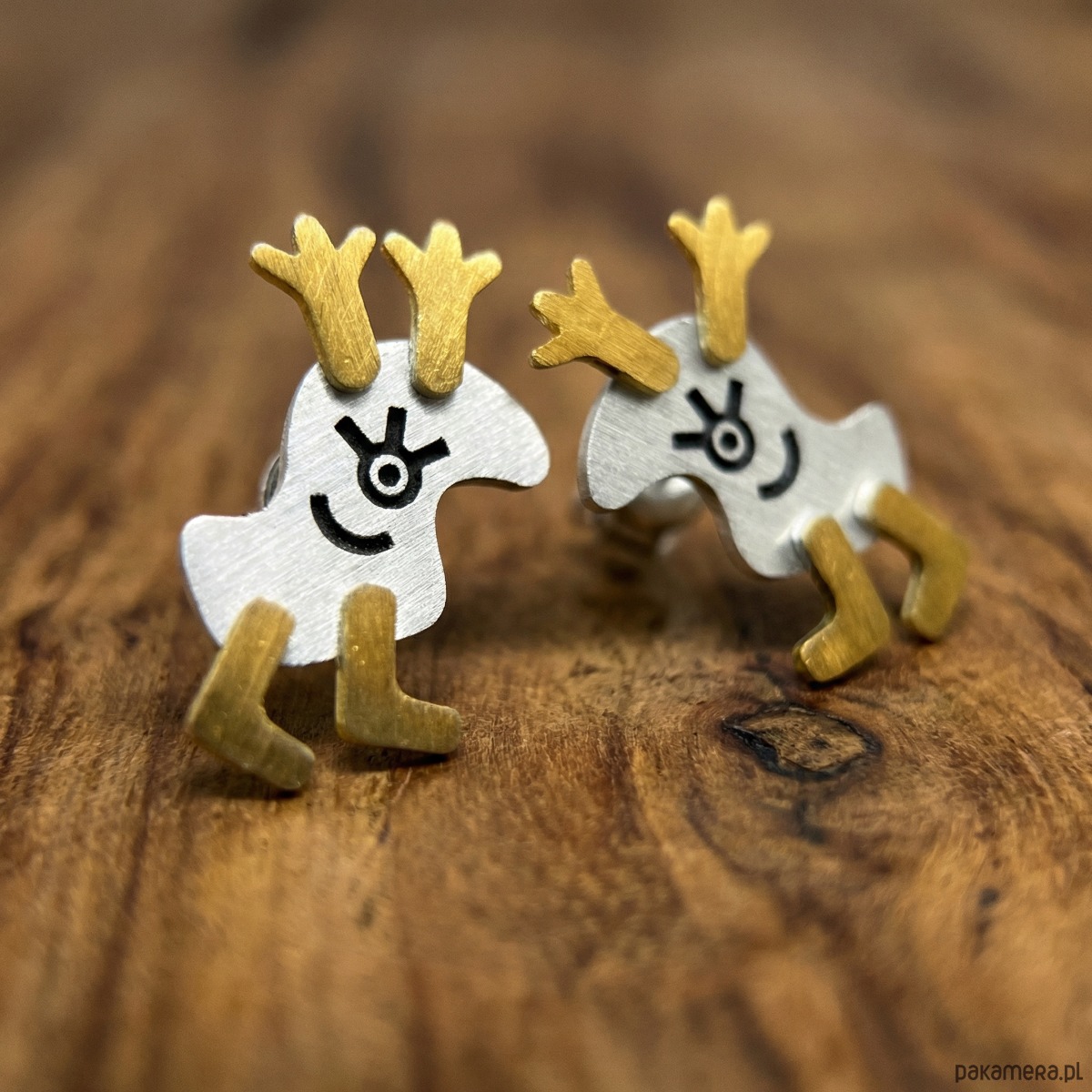 Srebrne, częściowo pozłacane i oksydowane kolczyki w kształcie uśmiechniętych Reniferów – Łosiów. Poruszają one nóżkami. Eleganckie i subtelne. Bardzo efektownie prezentują swoje wdzięki na uchu. Są idealne na oficjalne okazje, nie pozostaną niezauważone. Srebro ma próbę 0,925. Sztyfty zapinane srebrnymi barankami. Są długie na ok. 2 cm, szerokie na 1,5 cm.