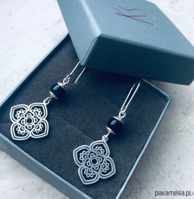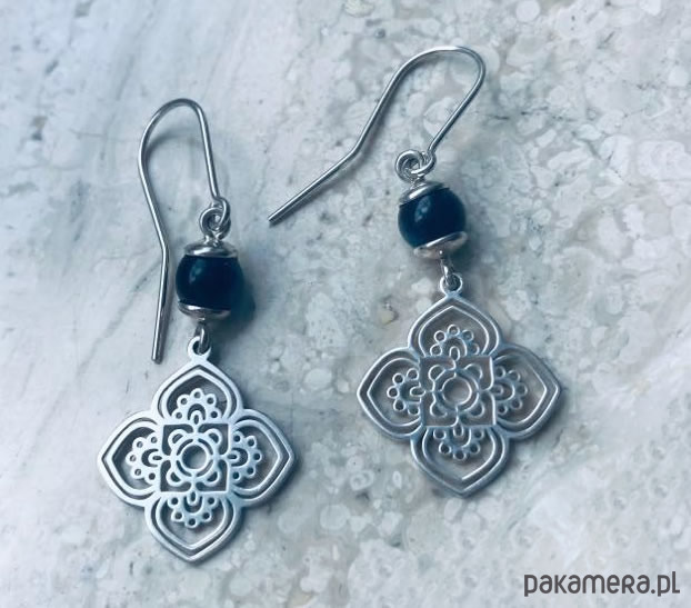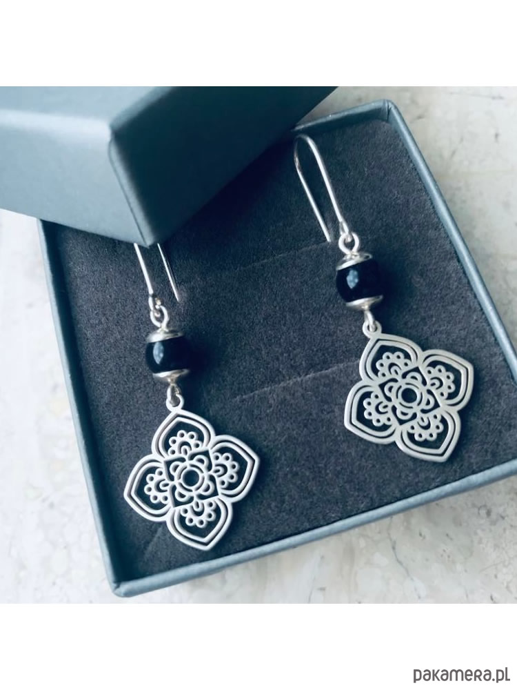 Ażurowe kolczyki w stylu boho z motywem kwiatu lotosu - symbolu piękna, czystości i doskonałości, wykonane w naszej pracowni ze srebra próby 925 oraz kuleczek z onyksu o średnicy 6mm. W kolczykach zastosowano bigle otwarte.