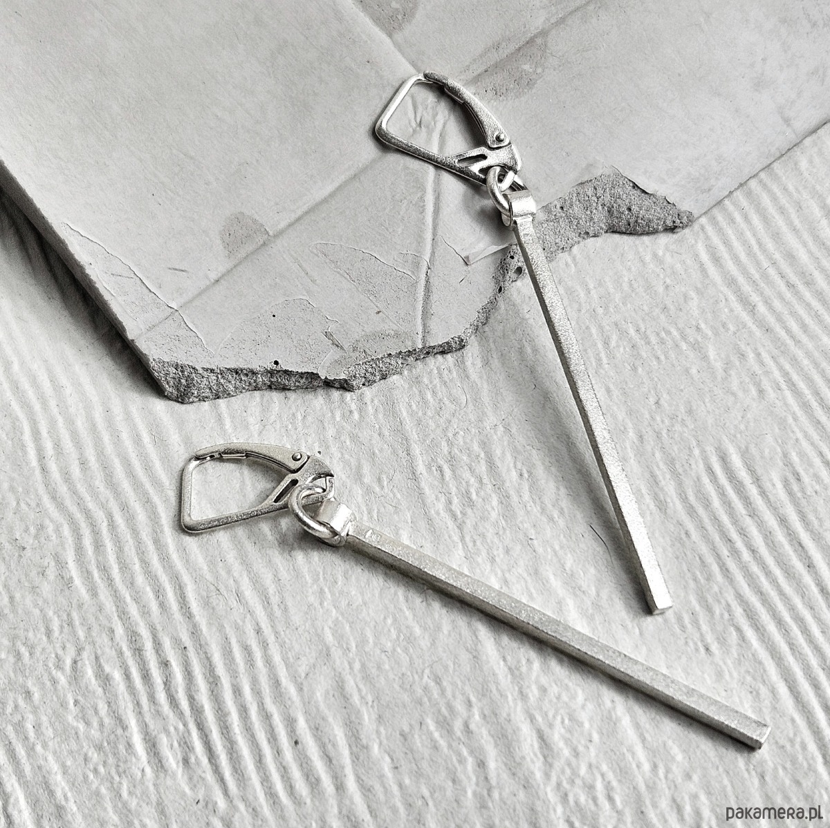 Niebanalne, nowoczesne srebrne kolczyki patyczki.