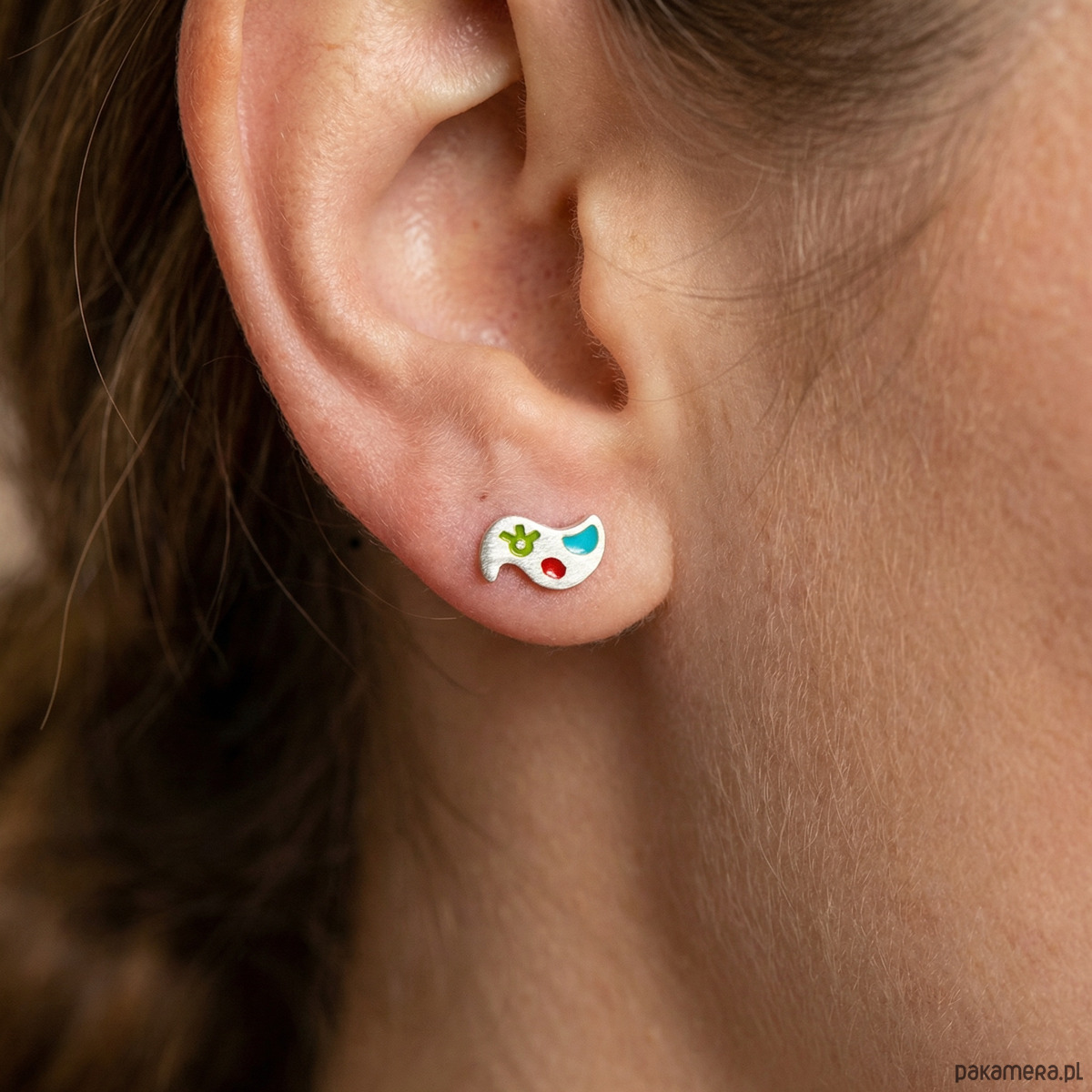 Srebrne, częściowo emaliowane kolczyki w kształcie uroczych ptaszków - jeden śpi, drugi na niego patrzy i się uśmiecha. Są długie na 0,9 cm, szerokie na 0,5 cm. Wykonane ręcznie kolczyki sztyfty zapinane zaopatrzone są w niezawodne srebrne zapięcia.