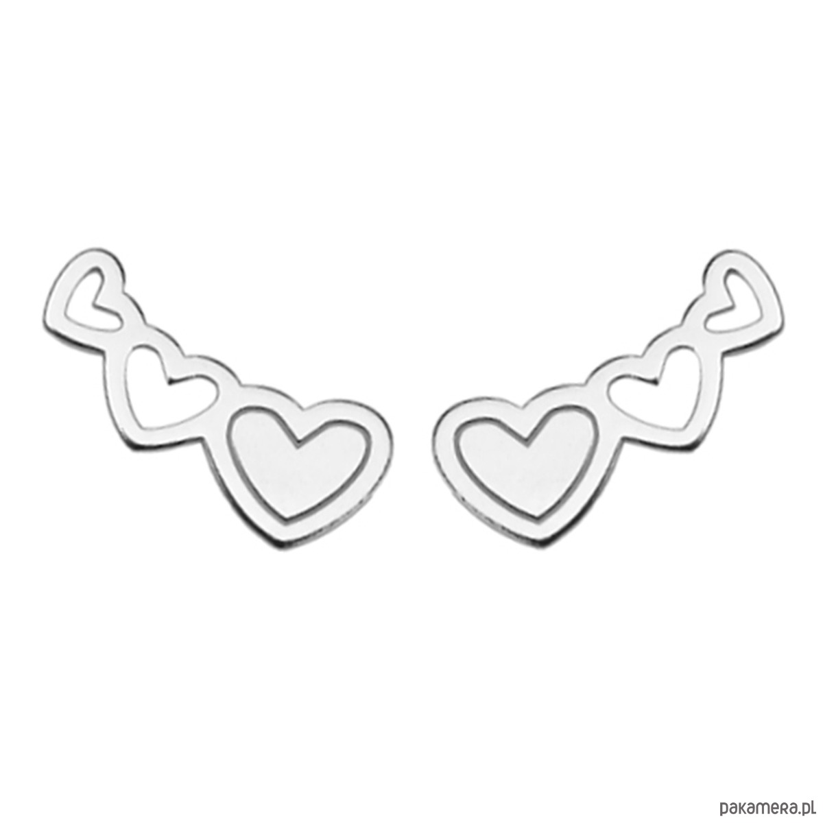Srebrne kolczyki w kształcie potrójnych serduszek. Zapinane na sztyft. Para ma lewy i prawy kolczyk. Kolczyki posiadają zapięcia (baranki). Kolczyki w całości wykonane są ze srebra 925.