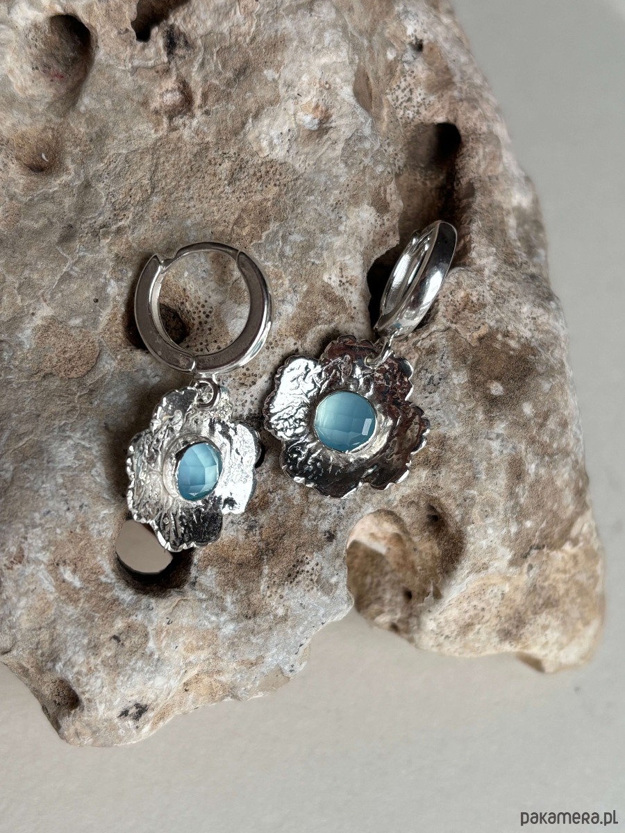 Srebrne kolczyki wiszące kwiatki to lekka i kobieca biżuteria o subtelnym charakterze. Wykonane ręcznie ze srebra 925, składają się z delikatnych kół z zawieszonymi, ręcznie robionymi kwiatkami. W centrum został oprawiony naturalny kamień agatu w odcieniu niebieskim.
