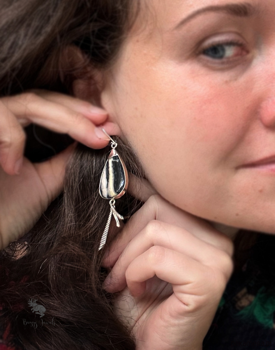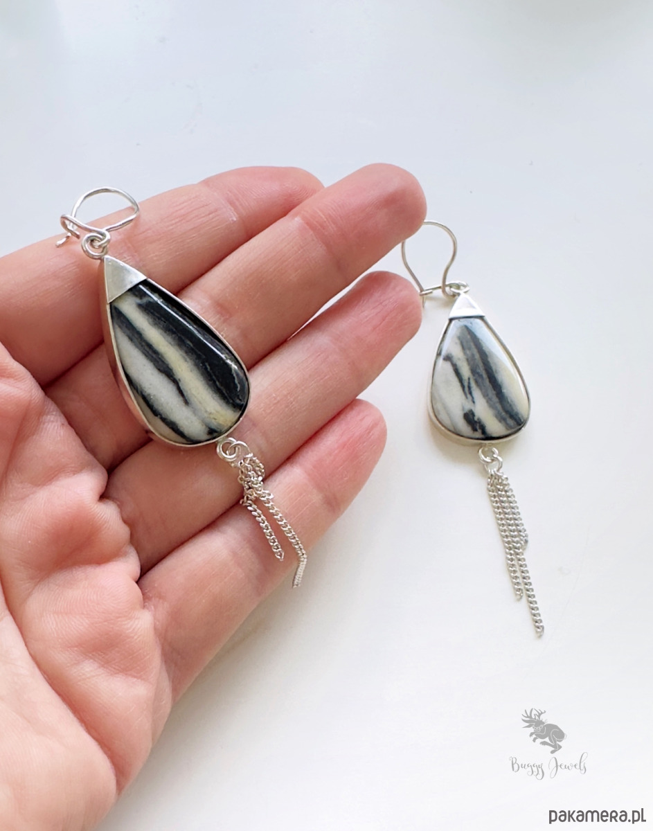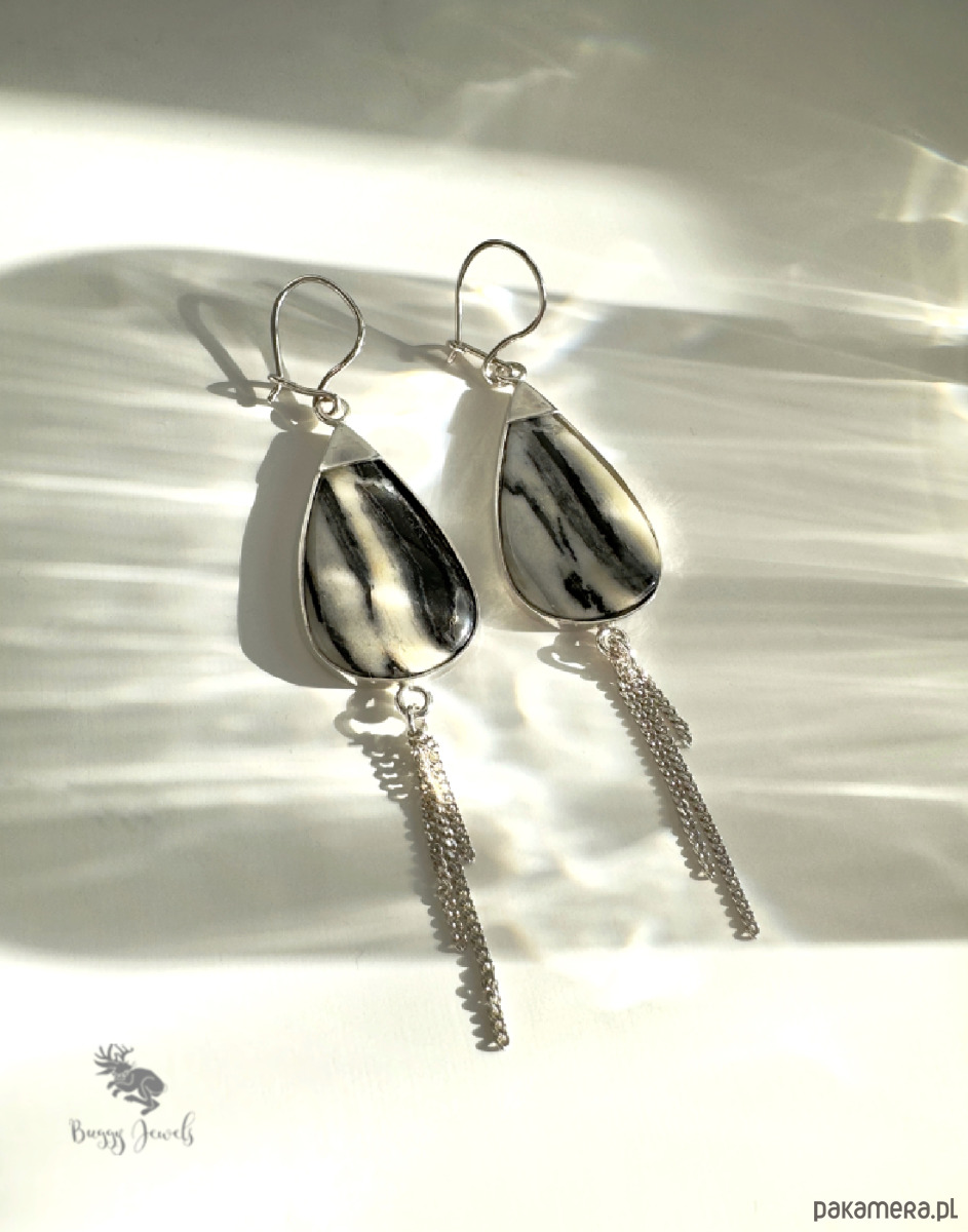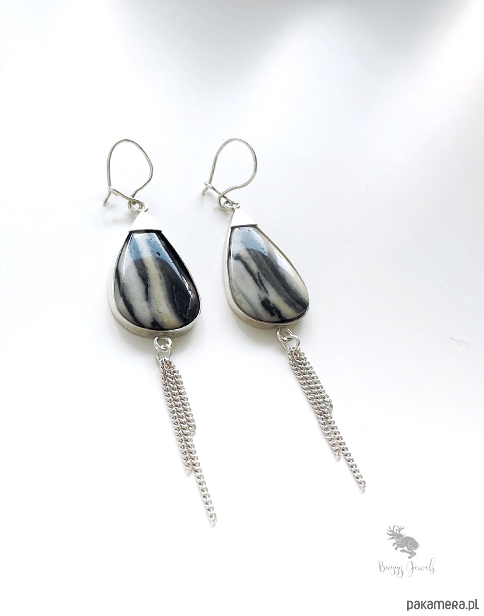 Ręcznie wykonane srebrne kolczyki z naturalnym jaspisem. Charakterystyczna biel kamienia ozdobiona jest czarnymi, nieregularnymi pasami. Delikatne, swobodnie wiszące łańcuszki dopełniają design, a całkowita długość około 7 cm sprawia, że kolczyki są doskonałym wyborem na co dzień oraz na specjalne okazje. Elegancka biżuteria dla miłośników klasycznych i niepowtarzalnych dodatków.