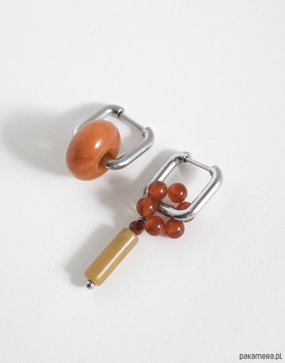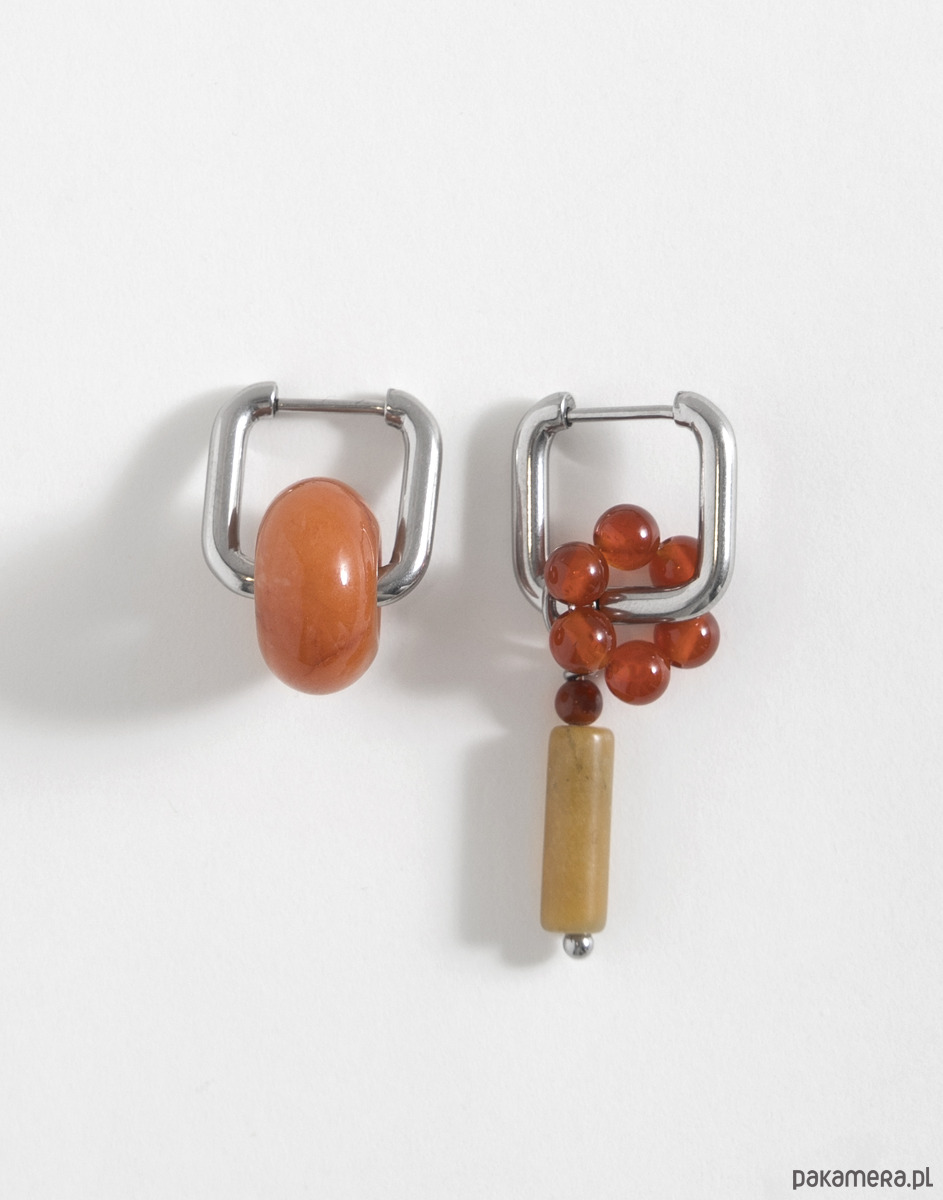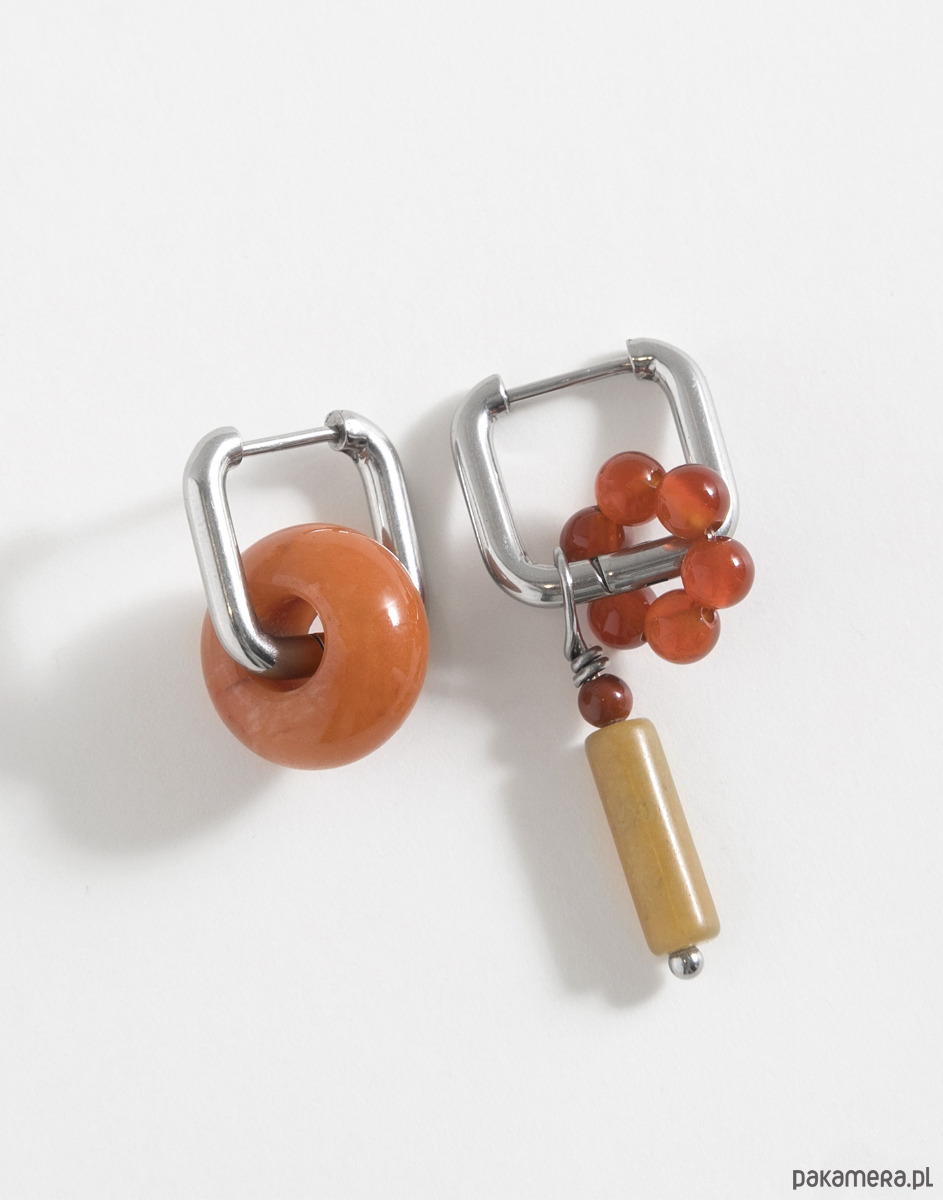Kolczyki wykonano ze stali chirurgicznej. Zestaw zawiera trzy wymienne zawieszki: oponkę z jadeitu, kwiatek z agatu oraz zawieszkę z jaspisu. Zawieszki można nosić razem, pojedynczo lub całkowicie je odpiąć, pozostawiając same kolczyki. Świetnie sprawdzą się też jako element naszyjnika – można je dowolnie komponować w zależności od stylizacji.