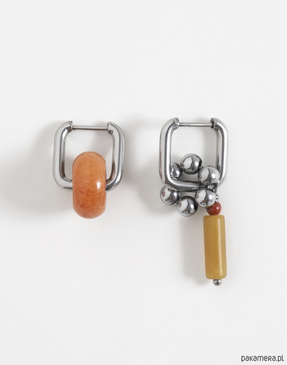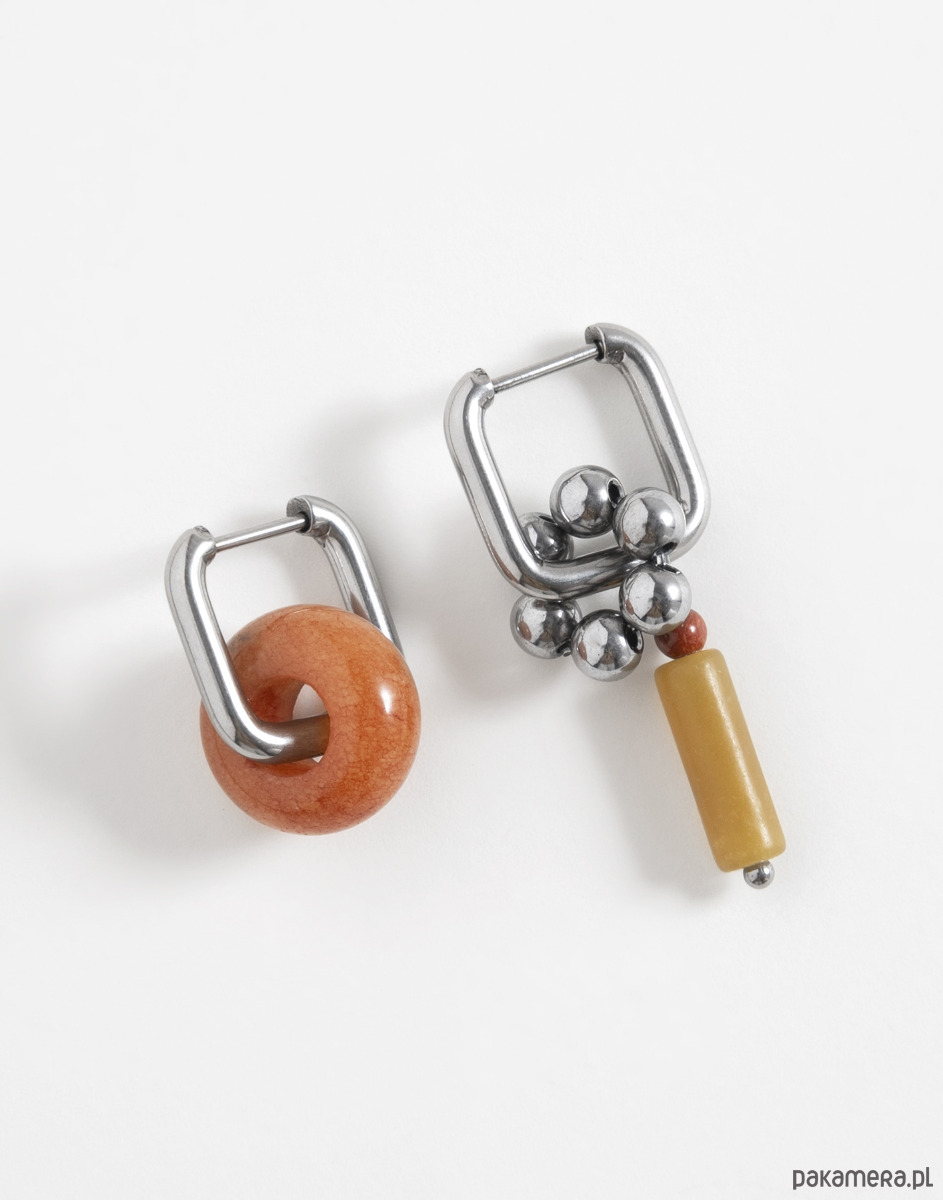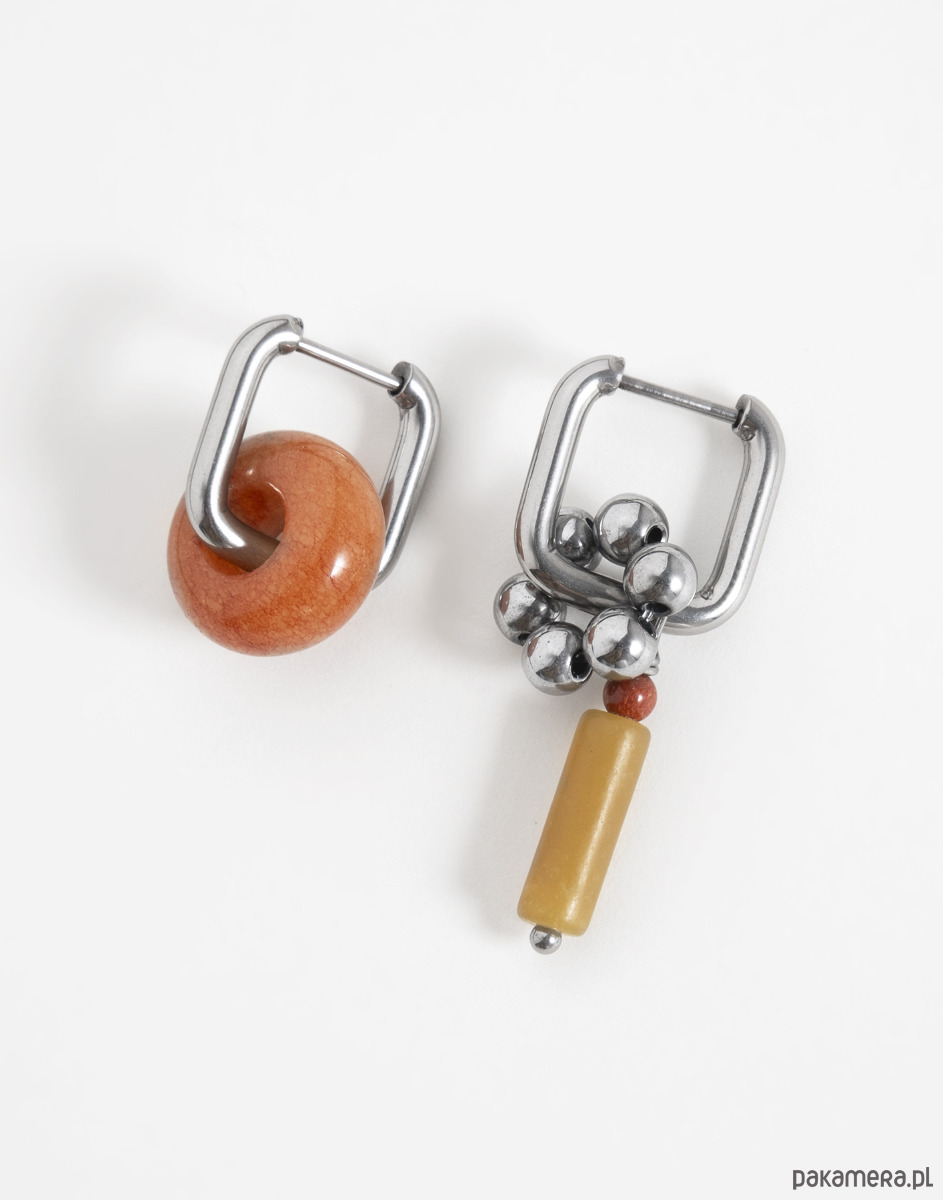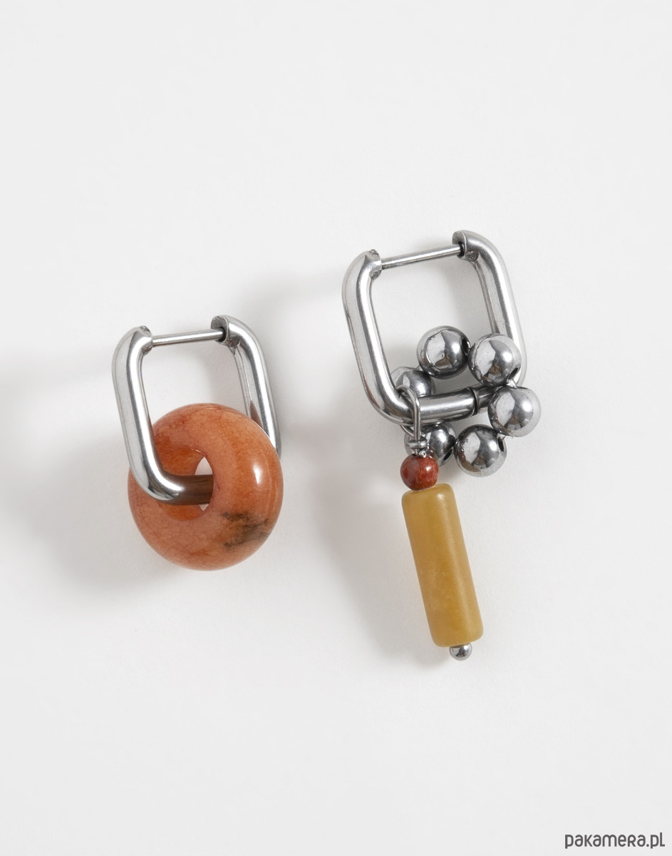 Kolczyki wykonano ze stali chirurgicznej. Zestaw zawiera trzy wymienne zawieszki: oponkę z jadeitu, kwiatek z hematytu oraz zawieszkę z jaspisu. Zawieszki można nosić razem, pojedynczo lub całkowicie je odpiąć, pozostawiając same kolczyki. Świetnie sprawdzą się też jako element naszyjnika – można je dowolnie komponować w zależności od stylizacji.