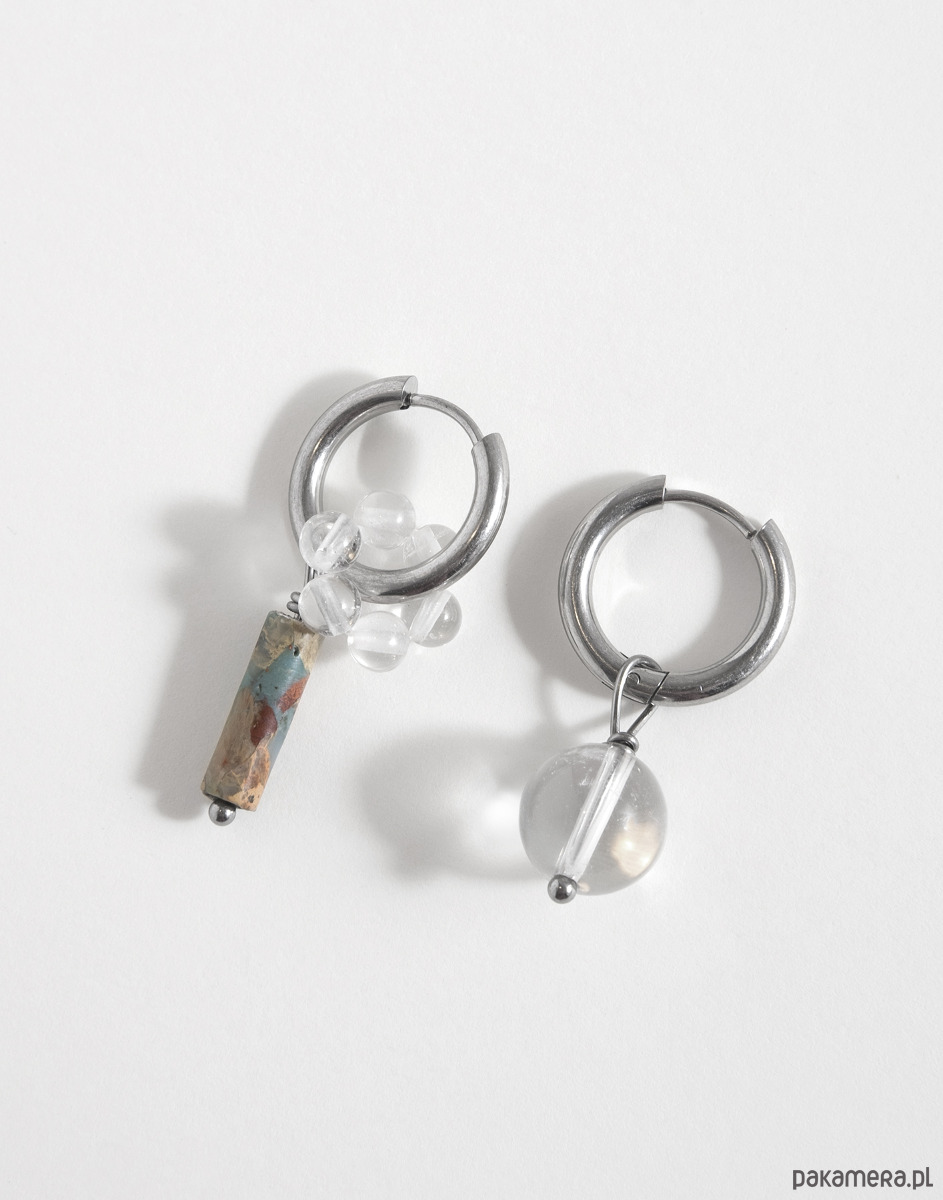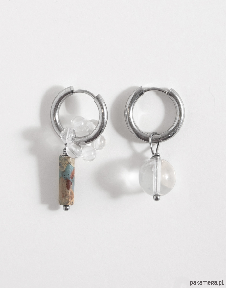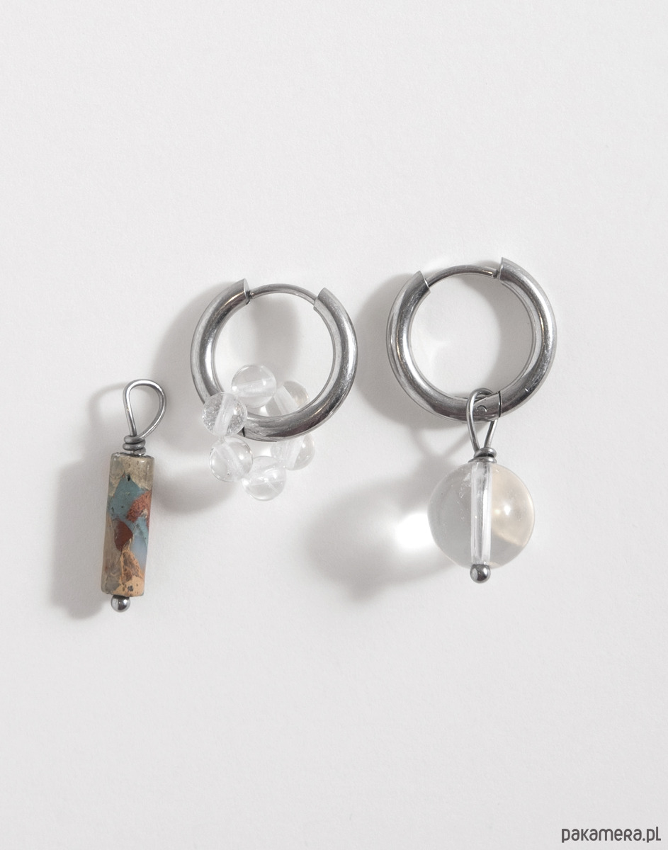 Kolczyki wykonano ze stali chirurgicznej. Zestaw zawiera trzy wymienne zawieszki: kwiatek z kryształu górskiego oraz zawieszki z jaspisu i kryształu górskiego. Zawieszki można nosić razem, pojedynczo lub całkowicie je odpiąć, pozostawiając same kolczyki. Świetnie sprawdzą się też jako element naszyjnika – można je dowolnie komponować w zależności od stylizacji.