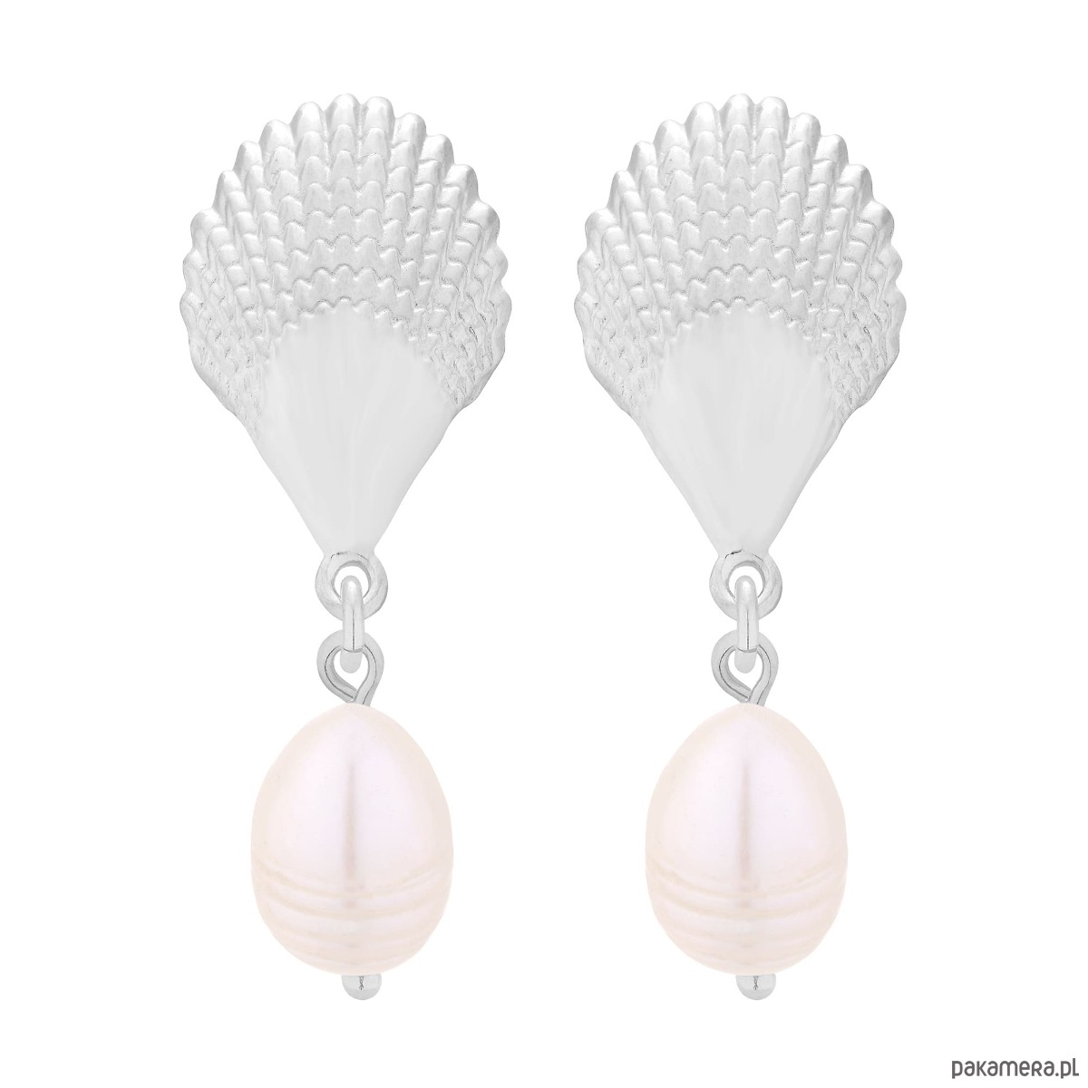 Srebrne kolczyki wykonane z muszelek i naturalnych pereł słodkowodnych.