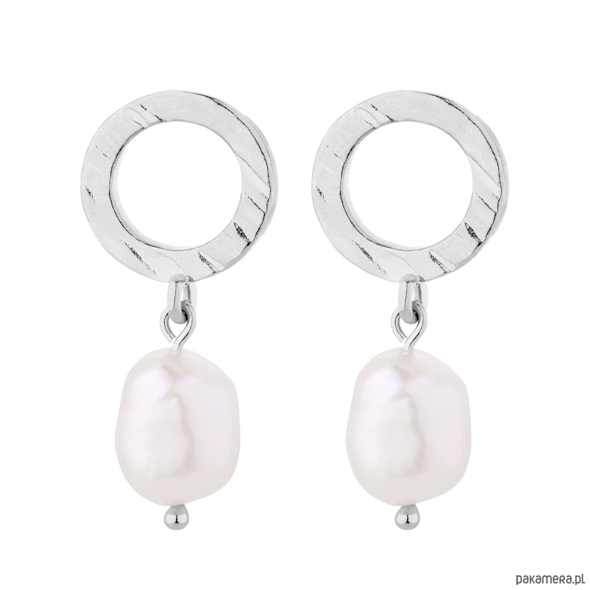 Srebrne kolczyki z chropowatymi kółeczkami i naturalnymi nieregularnymi perłami. Całość wykonana ze srebra 925. Zapinane na sztyft. Kolczyki posiadają zapięcia (baranki).