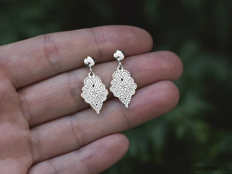 Niewielkie, góralskie kolczyki na sztyftach, ozdobione grawerem z motywem parzenicy.