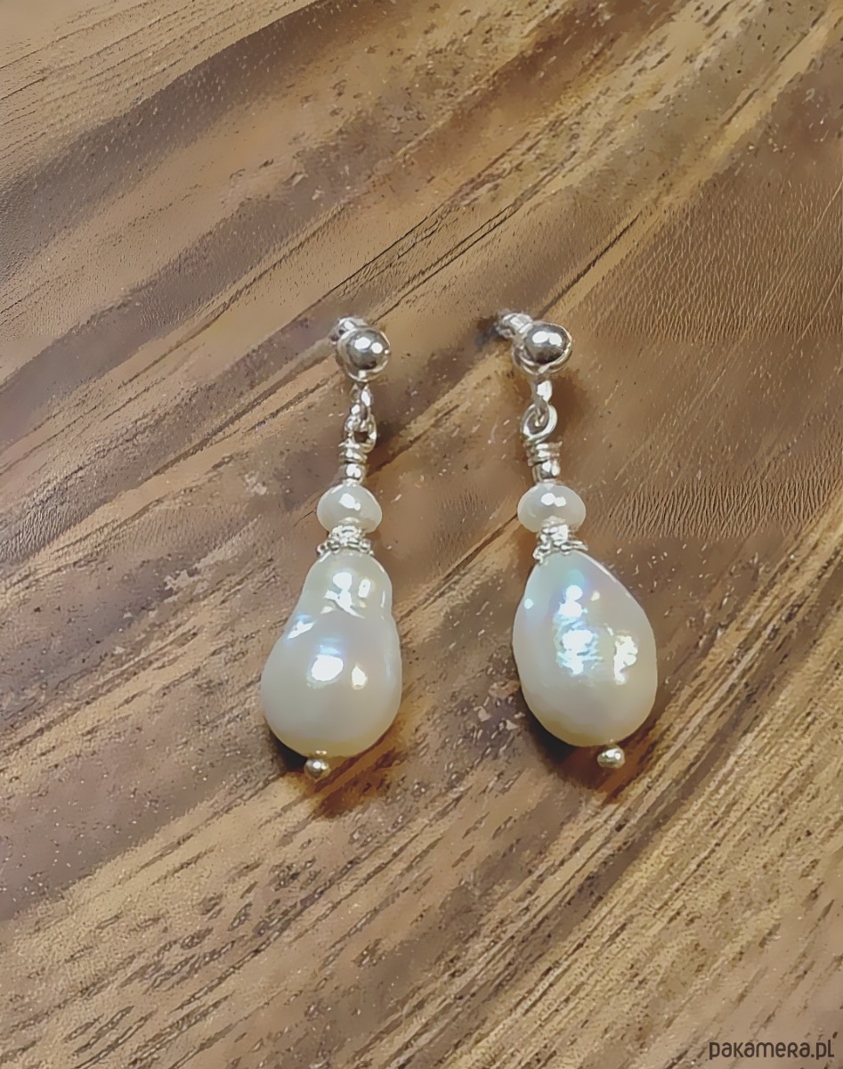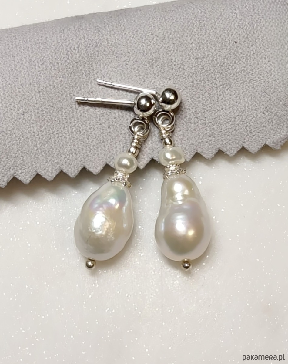 Kolczyki ze srebra z wiszącymi perłami barokowymi. Perły mają ciekawe kształty i powierzchnię, są błyszczące. W białym kolorze, który przy sztucznym świetle ukazuje delikatnie tęczowe overtony. Nad barokową perłą znajduje się ozdobny srebrny element i drobniejsza perełka. Kolczyki są zawieszone na srebrnym sztyfcie z kuleczką, ładnie kołyszą się podczas ruchu.