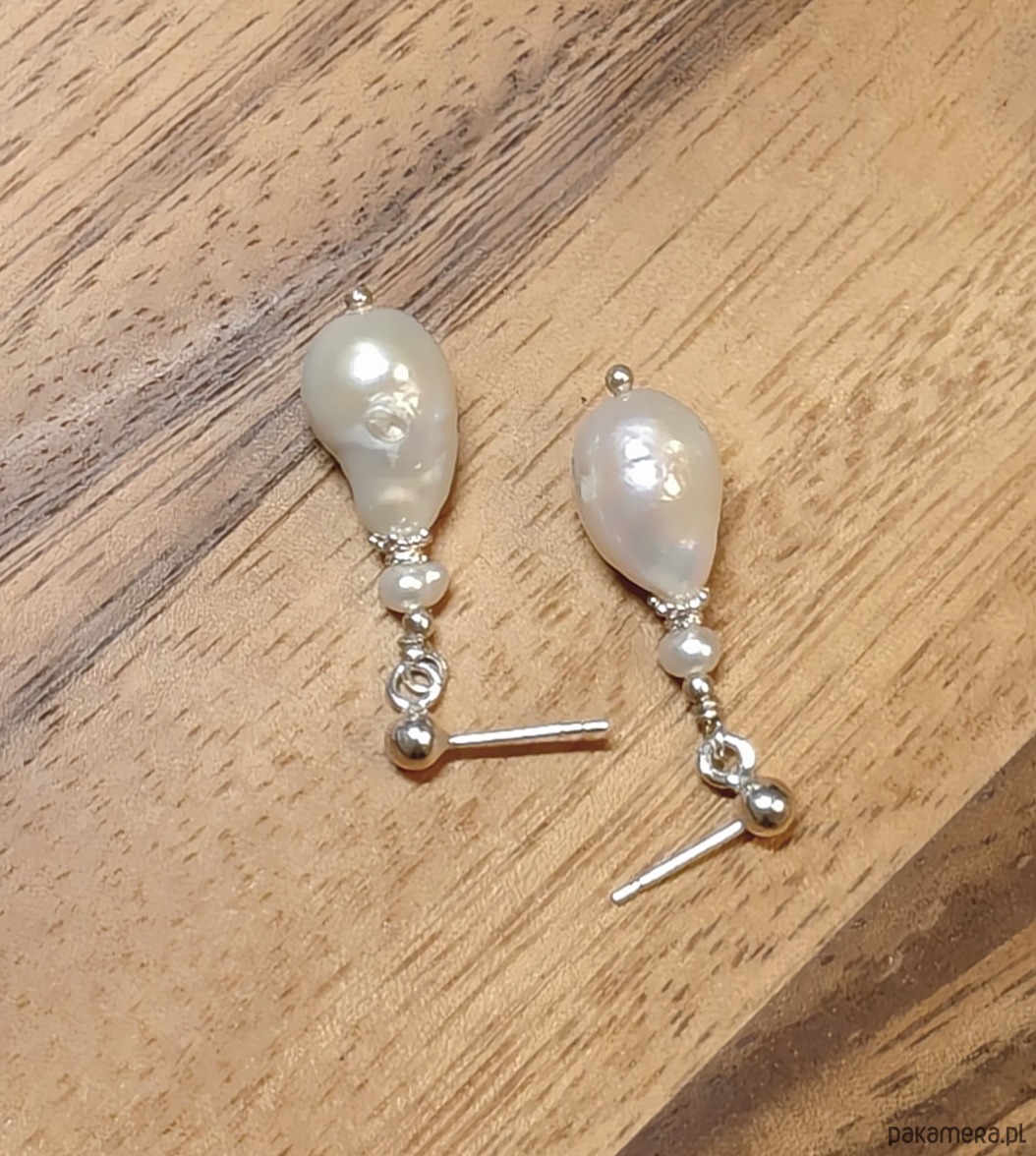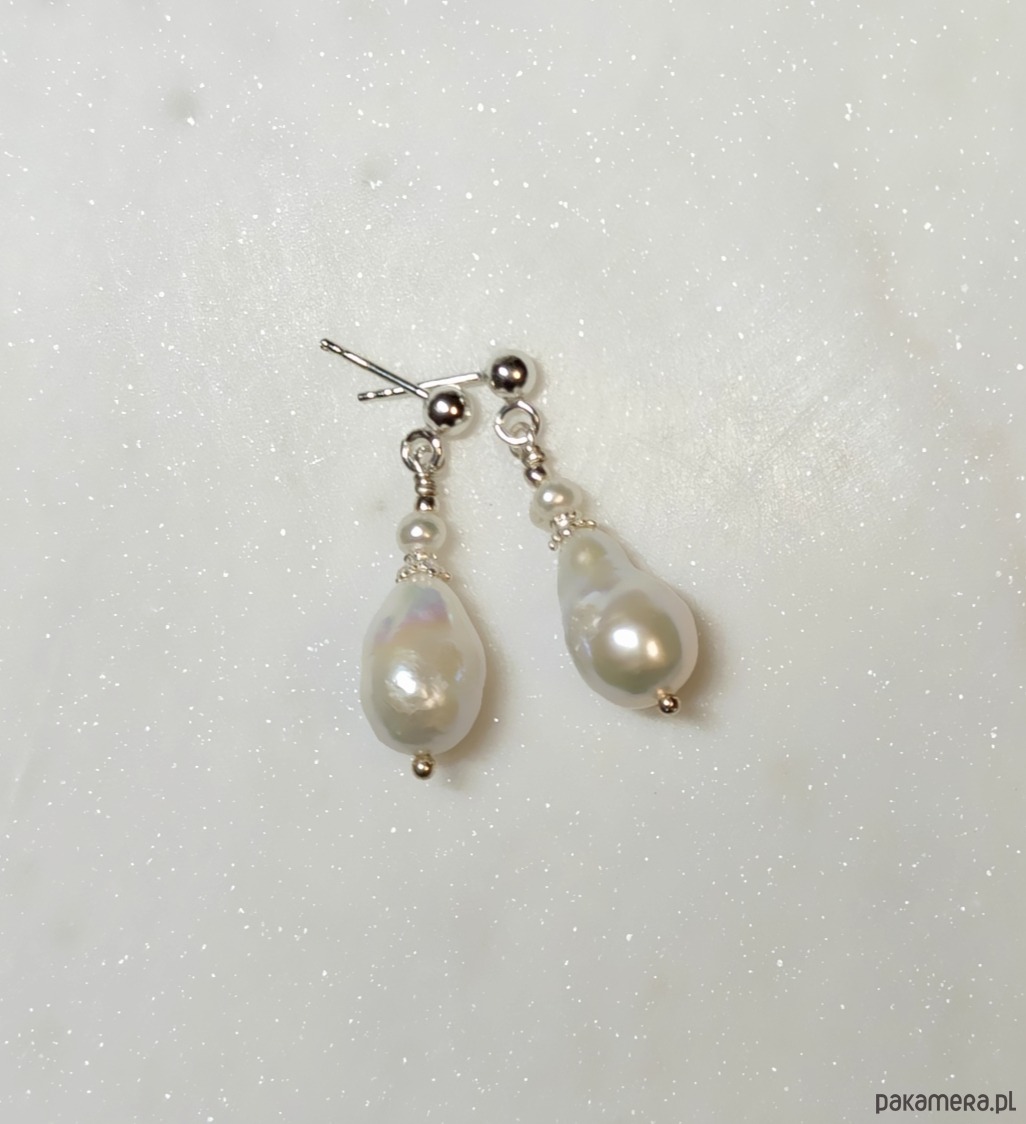 Kolczyki ze srebra z wiszącymi perłami barokowymi. Perły mają ciekawe kształty i powierzchnię, są błyszczące. W białym kolorze, który przy sztucznym świetle ukazuje delikatnie tęczowe overtony. Nad barokową perłą znajduje się ozdobny srebrny element i drobniejsza perełka. Kolczyki są zawieszone na srebrnym sztyfcie z kuleczką, ładnie kołyszą się podczas ruchu.