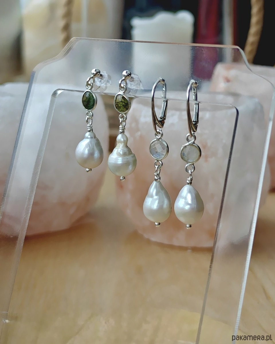 Długie, srebrne kolczyki z wiszącymi perłami barokowymi oraz kamieniami księżycowymi. Perły są nieregularne, mają ciekawe kształty i powierzchnię. Białe, błyszczące, z drobnymi nierównościami. Nad barokową perłą znajdują się zakute w srebro kamienie księżycowe, które w świetle mienią się w odcieniach błękitu. Całości dopełniają zamknięte, podłużne bigle (angielskie).