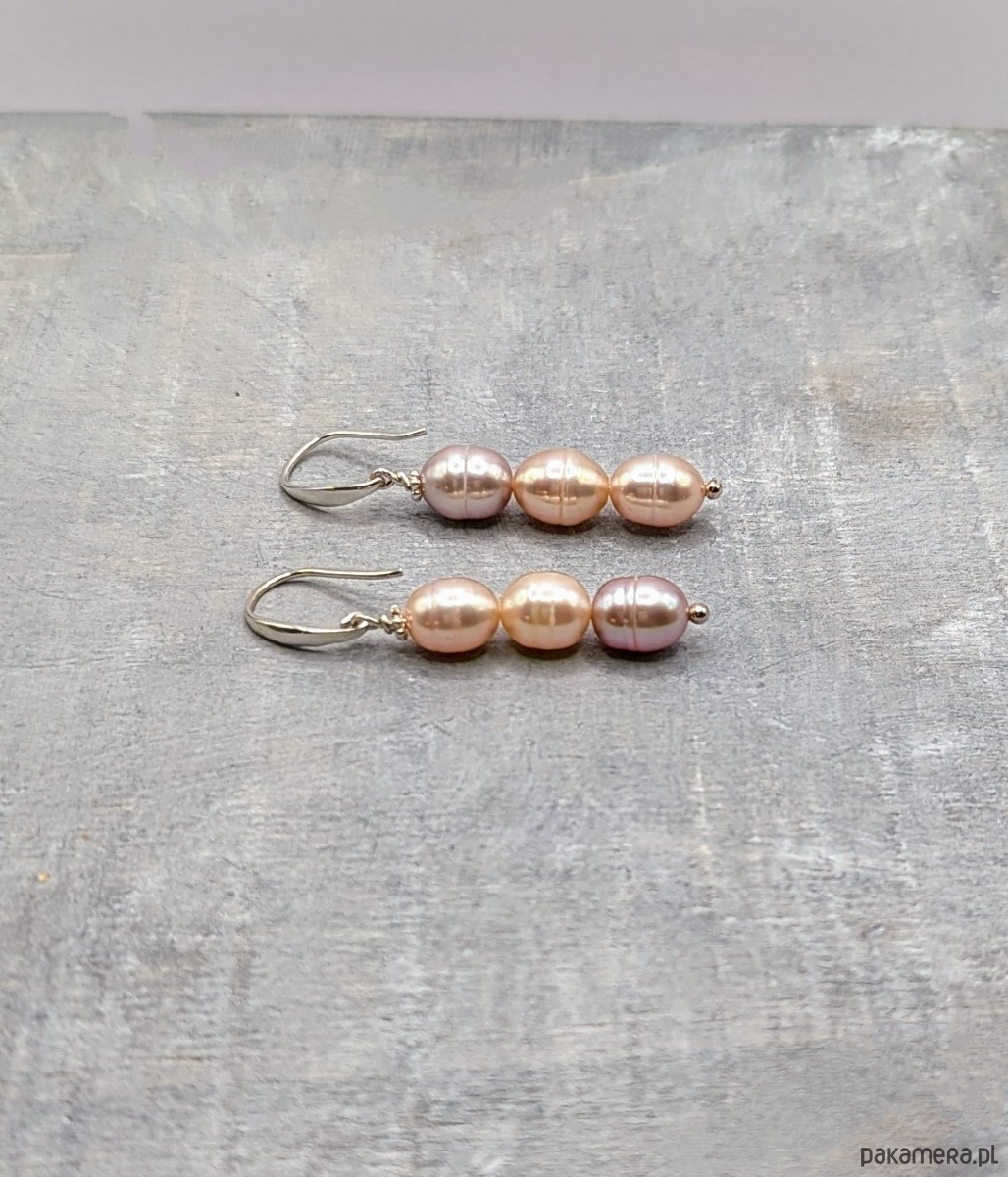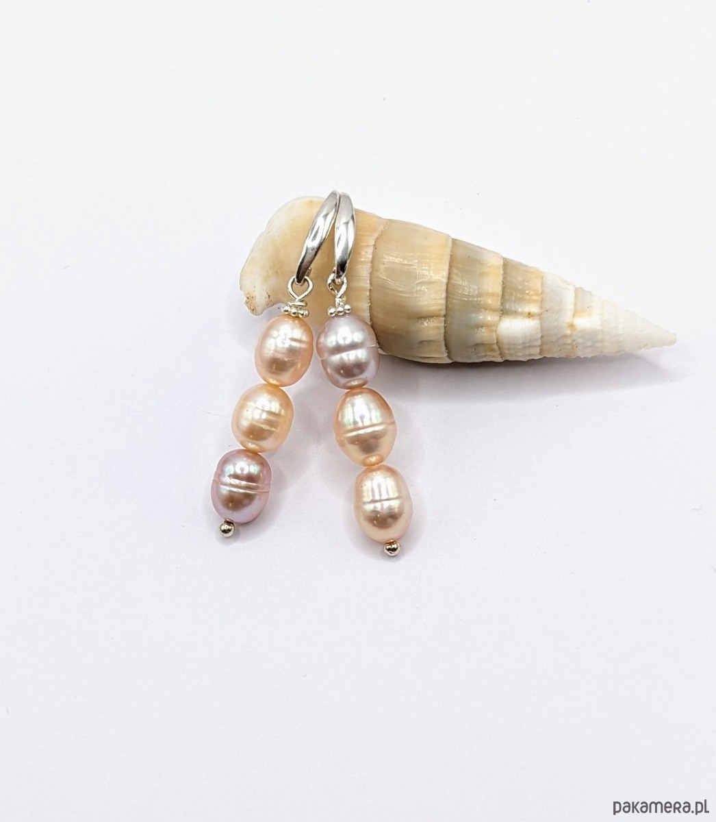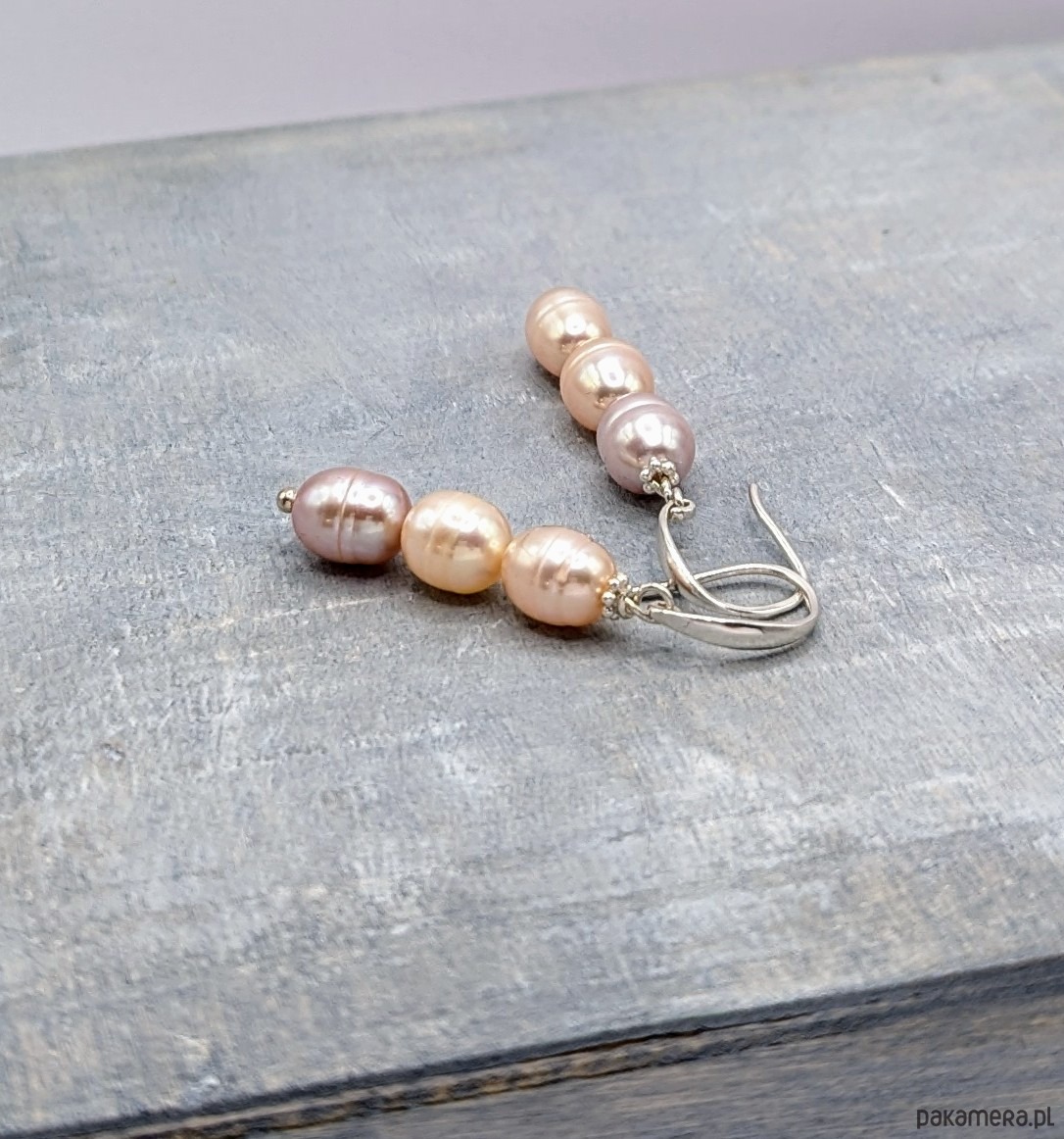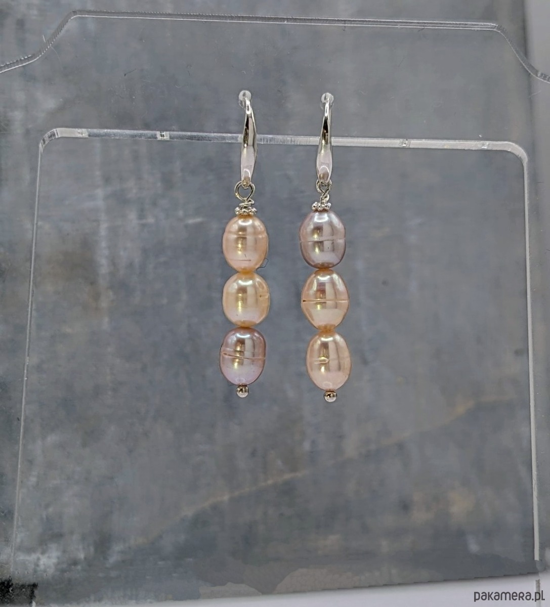 Srebrne kolczyki z błyszczących, podłużnych perełek w różowo -złotawym kolorze. Zawieszone na otwartym biglu. Długość całkowita ok. 4,5 cm.