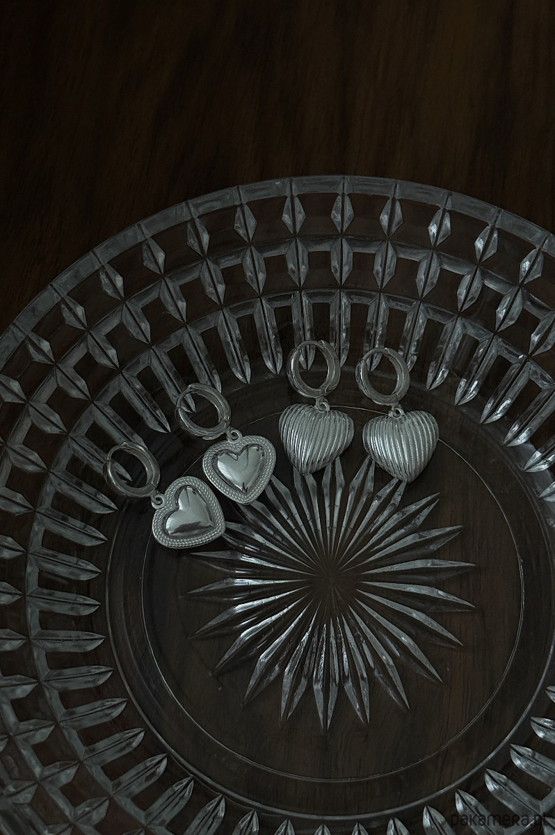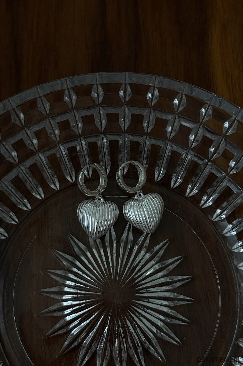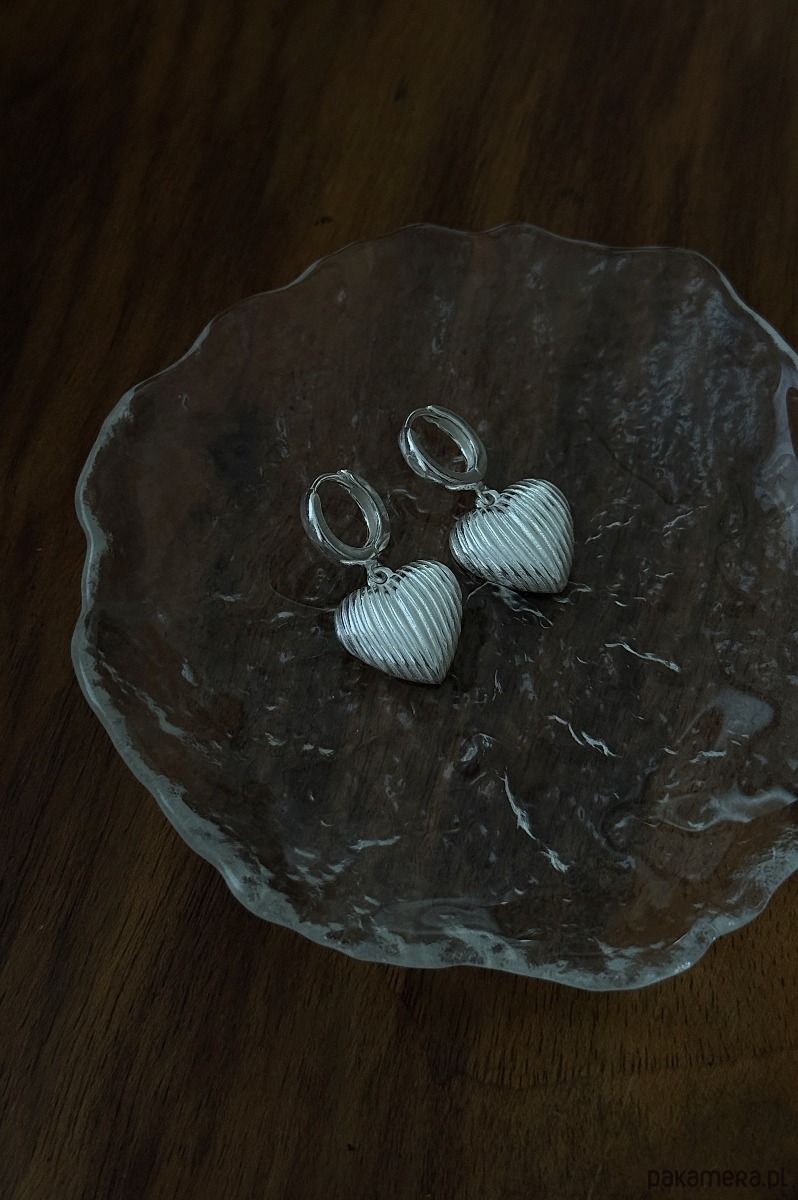 Srebrne kolczyki serca z rowkowaną powierzchnią zawieszone na zamykanych biglach.. Całość wykonana ze srebra 925.