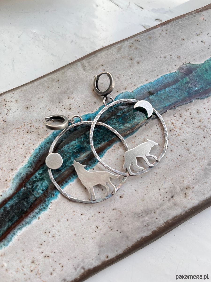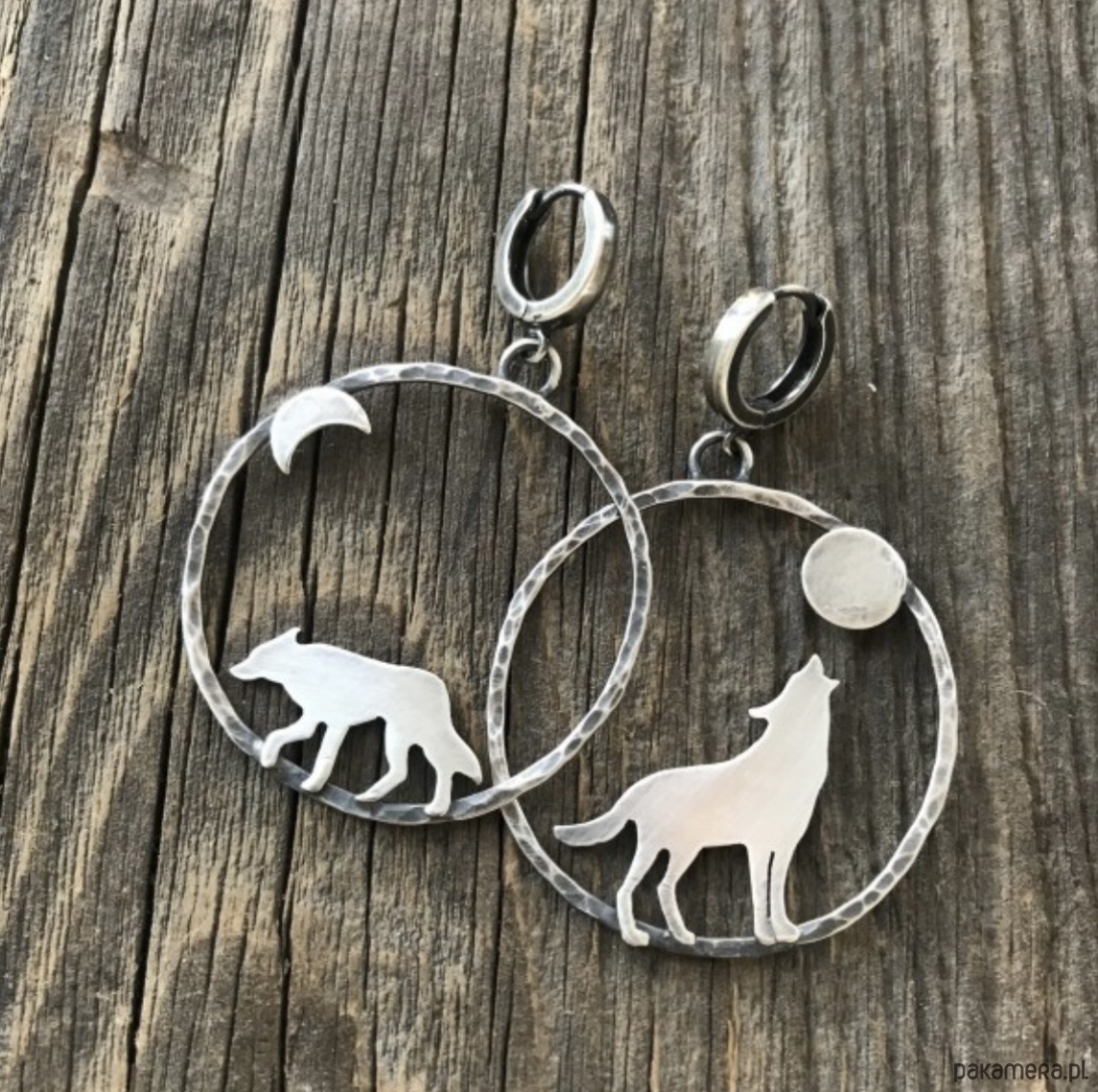 Duże, lekkie kolczyki z wilkami wykonane od podstaw ręcznie w srebrze pr 925. Srebro oksydowane i lekko polerowane. Wilki zawieszone na zapinanych biglach.