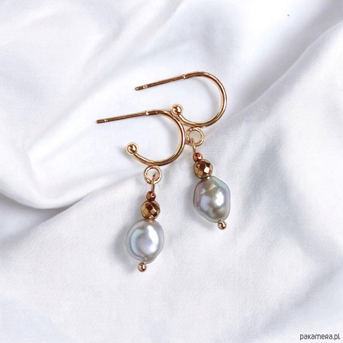 wykonane z pięknych, mocno nieregularnych pereł naturalnych, słodkowodnych w kolorze SREBRNYM oraz fasetowanych kuleczek złotego hematytu 4 i 1,8mm.