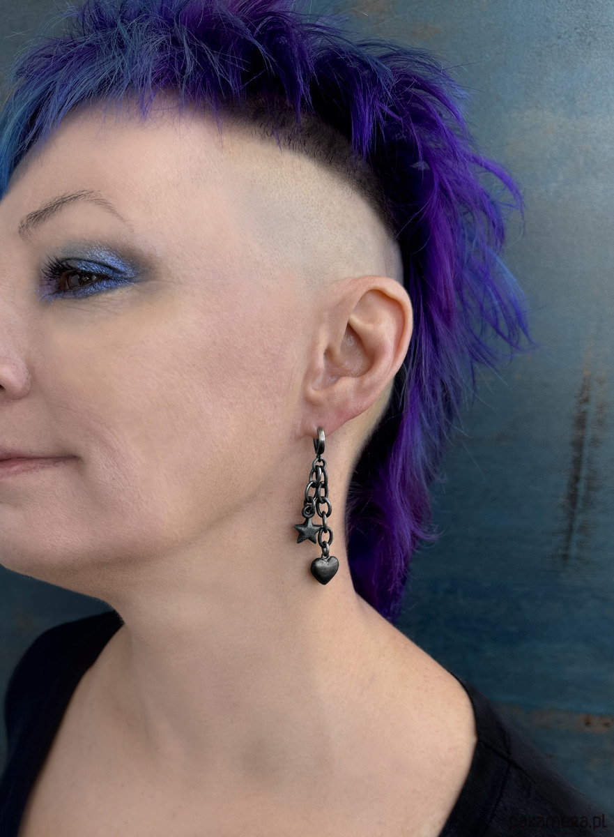 Wiszące, autorskie kolczyki wykonane z oksydowanego srebra próby 925. Odjazdowy dodatek do casualowych kreacji. Idealny wybór, jeśli chcesz wyrazić swój temperament i osobowość ciekawą biżuterią.
