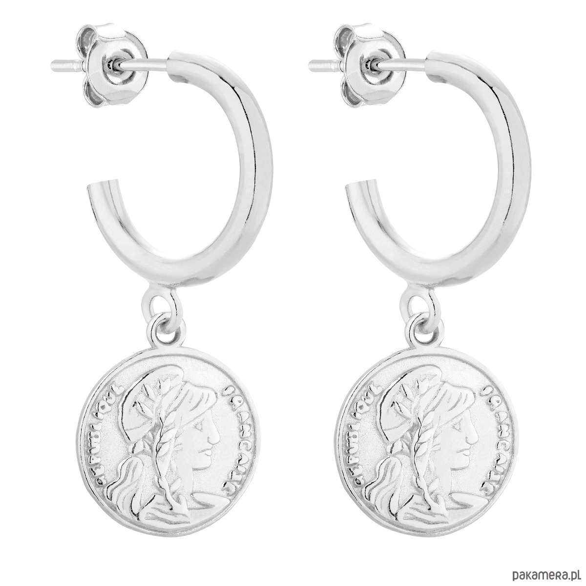 Grube, półokrągłe, srebrne kolczyki z monetami. Całość wykonana ze srebra 925.