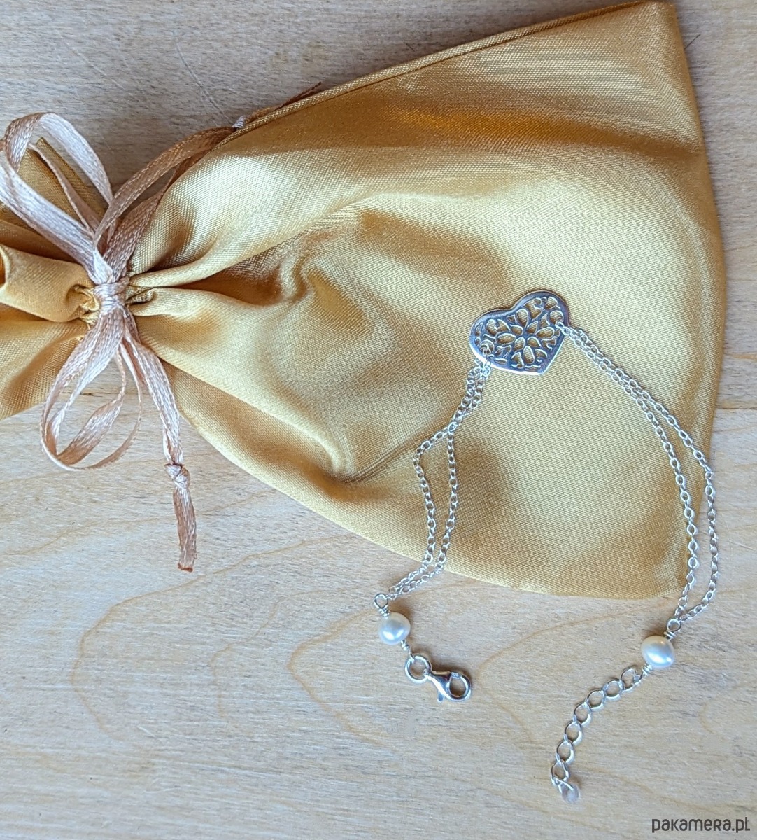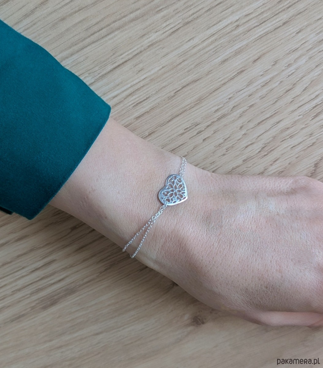 Serduszko na podwójnym łańcuszku wykończonym prawdziwymi perłami. Drobiazg, który symbolizuje Twoje uczucia. Łańcuszek jest przełożony przez oczko ażurowego serca, a całość ładnie układa się na nadgarstku. Klasyczna i romantyczna biżuteria, wspaniały prezent. Przy wysyłce zostanie zapakowana w pudełeczko z logo marki.