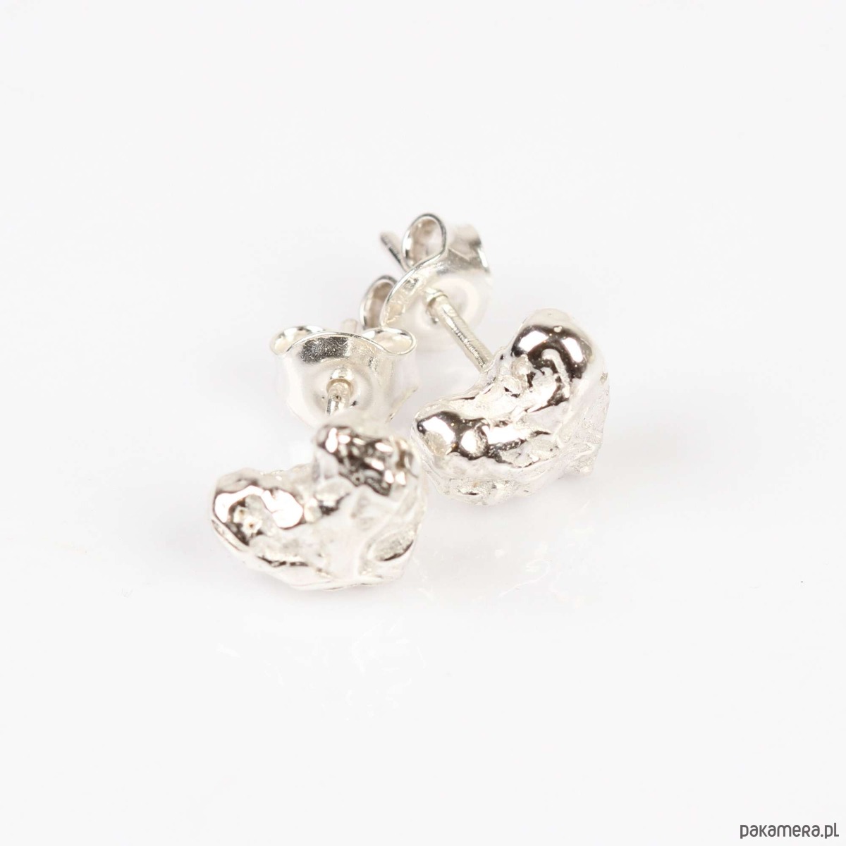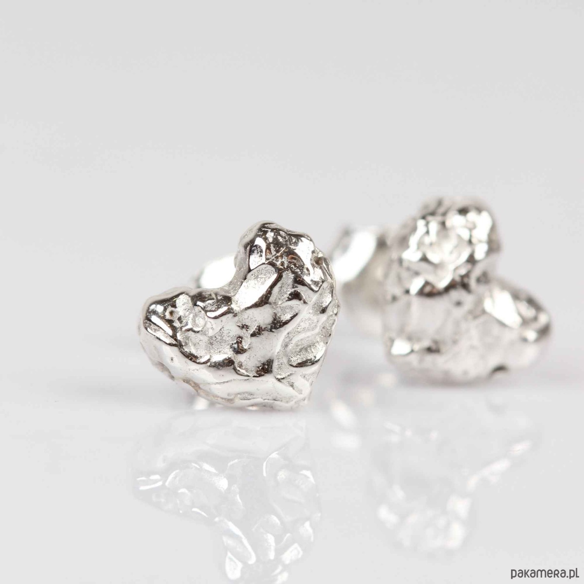Srebrne kolczyki sztyfty z organicznymi serduszkami ręcznie uformowanymi ze srebra.