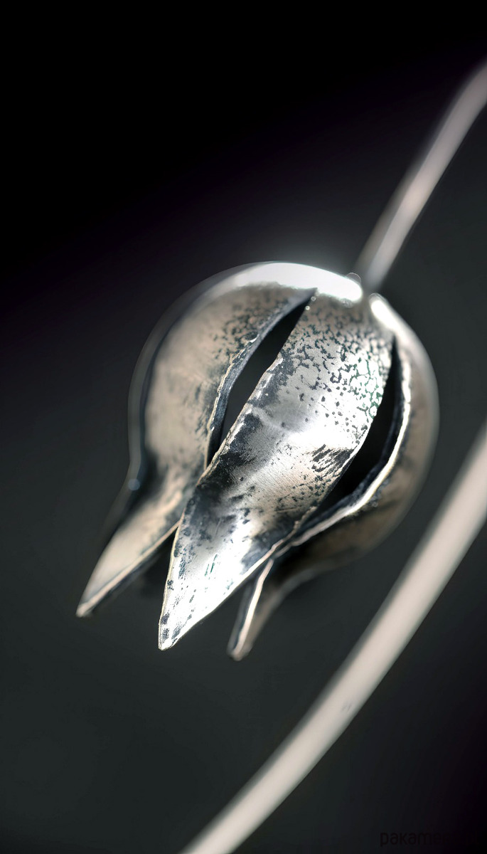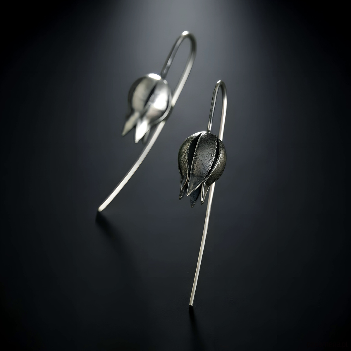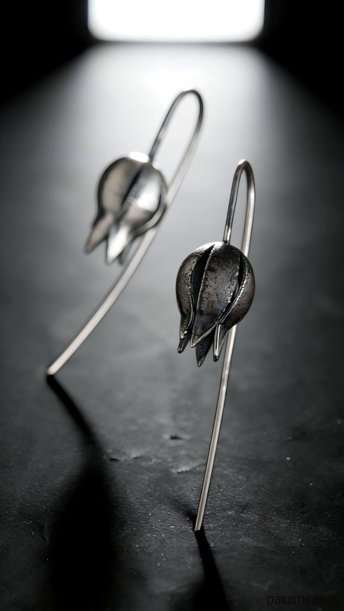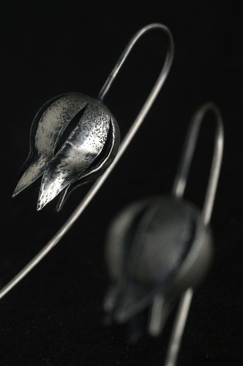 Ręcznie profilowane kolczyki inspirowane motywem baśniowych, tulipanowych kwiatów. Wykonane zostały w całości z oksydowanego srebra próby 925. Niezobowiązujące, tajemnicze i niepowtarzalne. Kolczyki z charakterem stworzone dla kobiet z fantazją :)