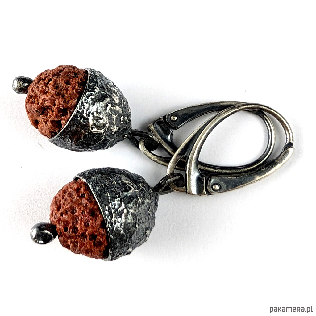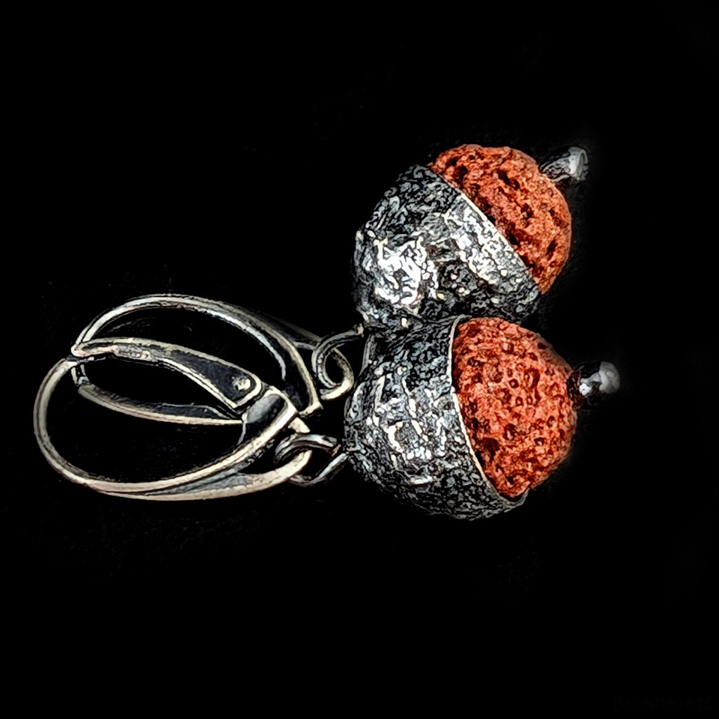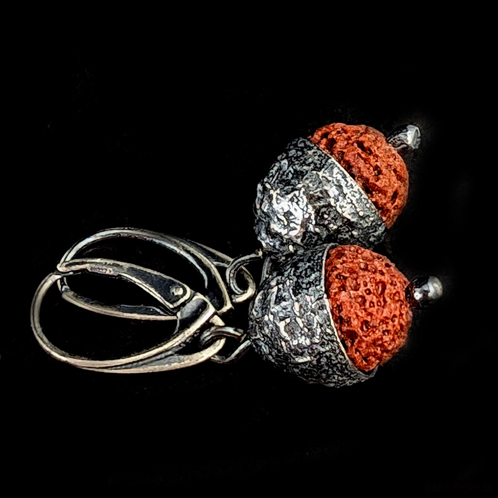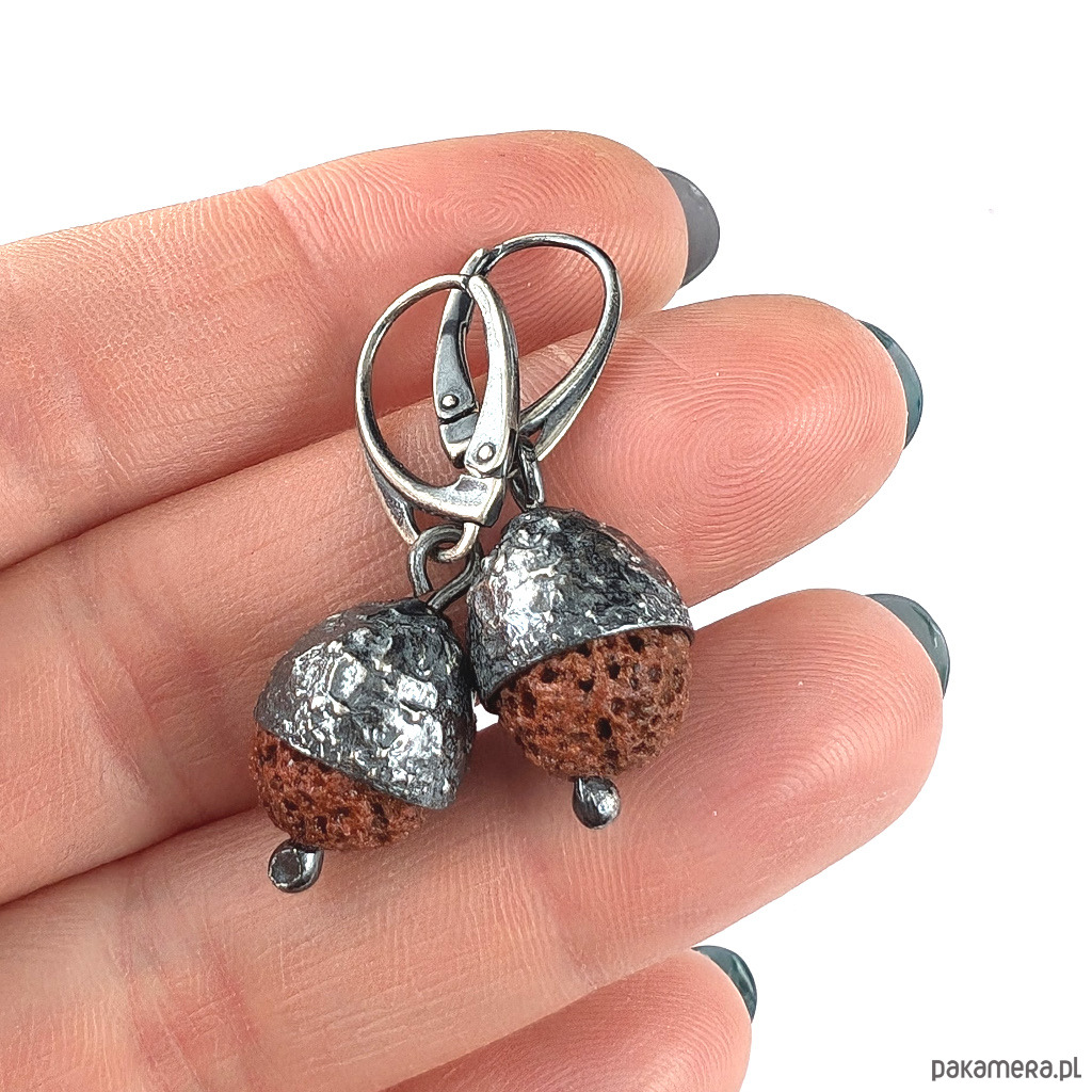 Kolczyki wykonane ze srebra próby 925 oraz lawy wulkanicznej. Czapeczki dębowe wykonane ze srebra. Oksydowane. Długość kolczyków z angielskimi biglami 37 mm. Średnica w czapeczce 11 mm. Waga jednego kolczyka 3,3 grama. Zostaną zapakowane w ozdobne pudełeczko.