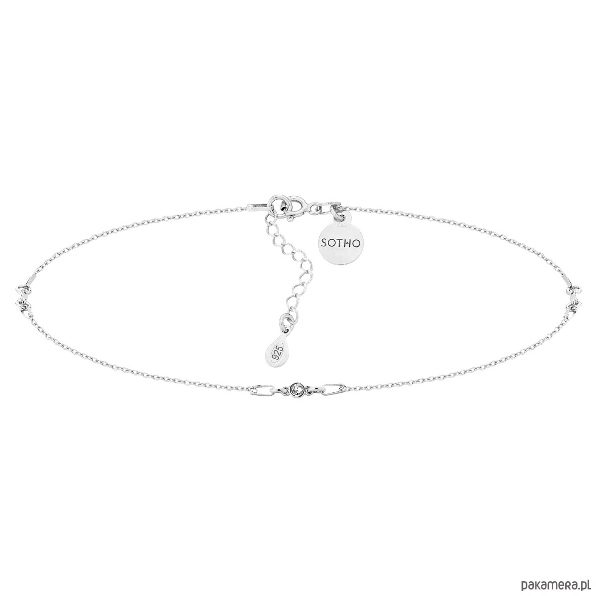 Srebrny łańcuszkowy choker zdobiony trzema bezbarwnymi kryształami SWAROVSKI® CRYSTAL w kolorze Crystal i zawieszką z logo marki. Naszyjnik posiada łańcuszek regulacyjny. Całość wykonana ze srebra 925.