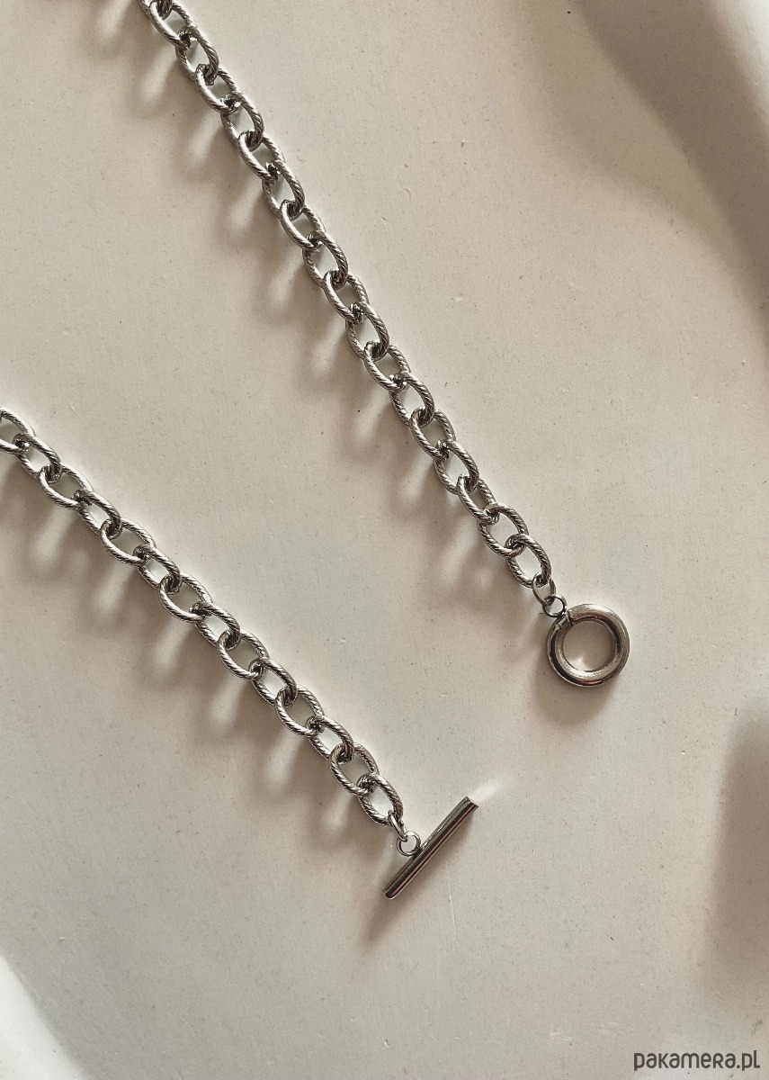 Zapięcie typu toggle jest wygodne w użytkowaniu oraz umożliwia noszenie go na piersi, przez co łańcuszek układa się w kształt V.