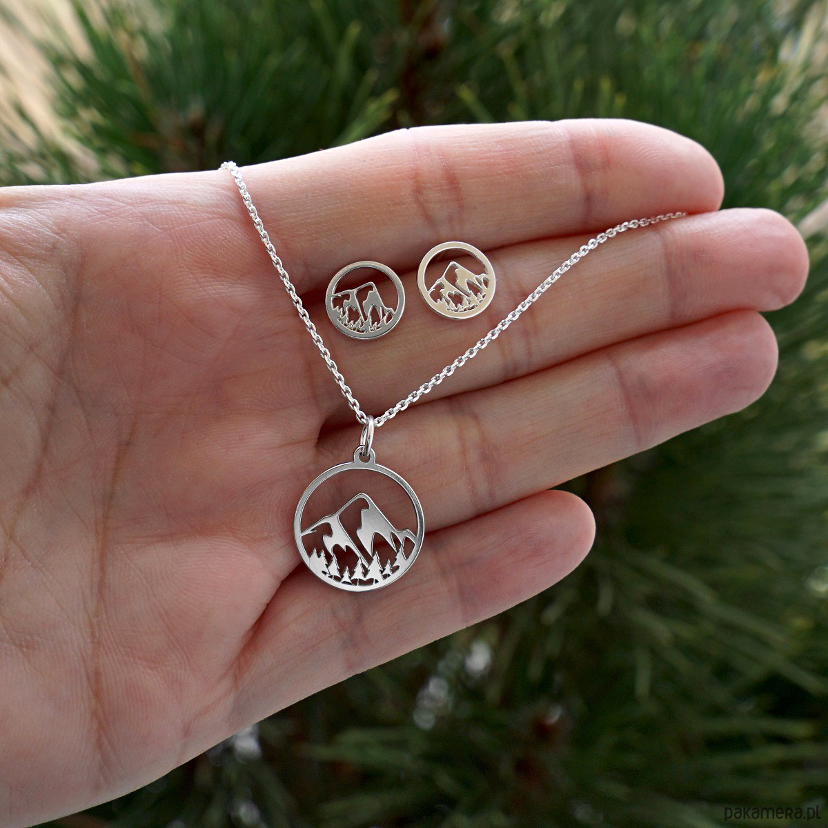 Zawieszka i sztyfty ozdobione zostały misternym, górskim motywem.