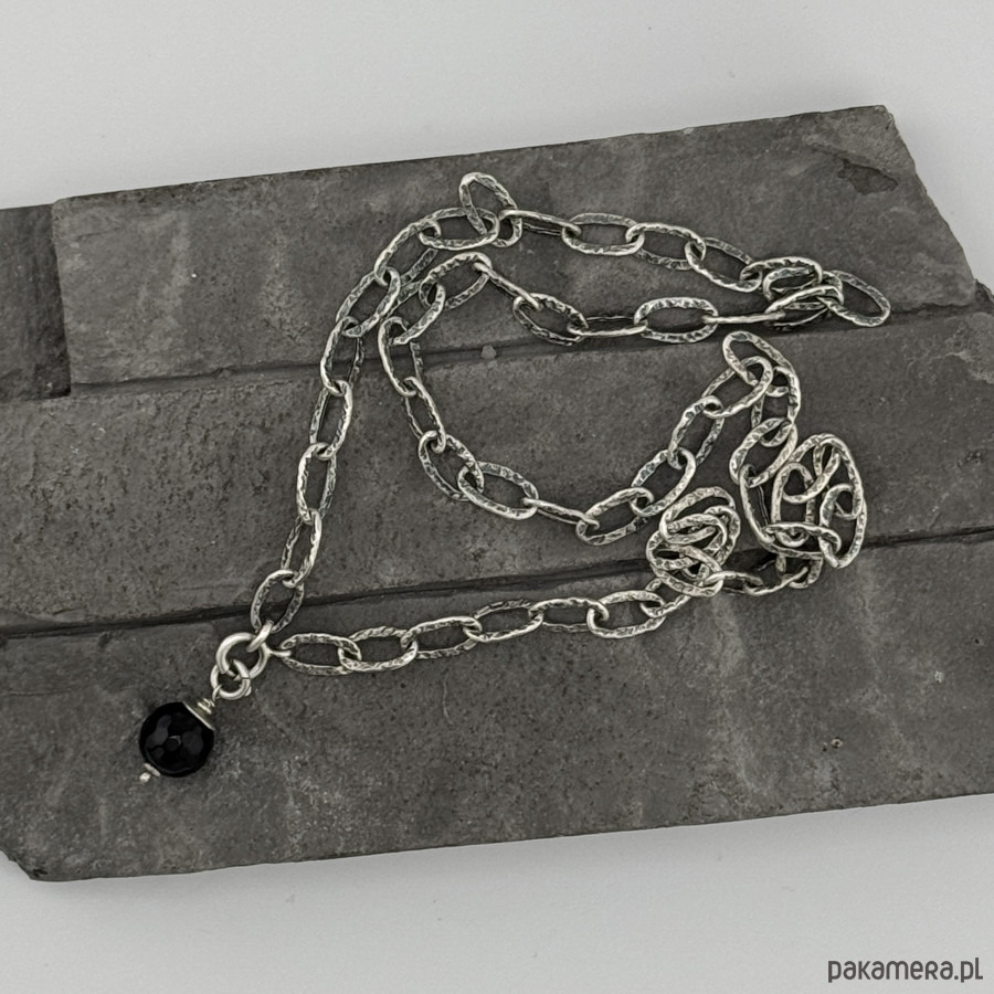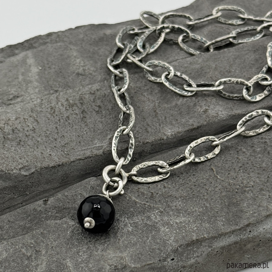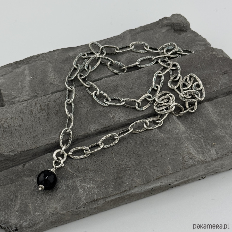 Minimalistyczny, modny, masywny naszyjnik na co dzień i nie tylko. Wykonany w całości z oksydowanego srebra próby 925 oraz fasetowanej kulki onyksu oprawionej w srebro wielkoscii 10 mm. Zawieszkę mozna ściągnąć z zapiecia i naszyjnik nosić jako łańcuch. Wielkość ogniw łańcucha to 11x5,5 mm. Zawieszkę mogę wykonać również z innym kamieniem. Obwód naszyjnika to 50 cm. Ozdobnie zapakowany.