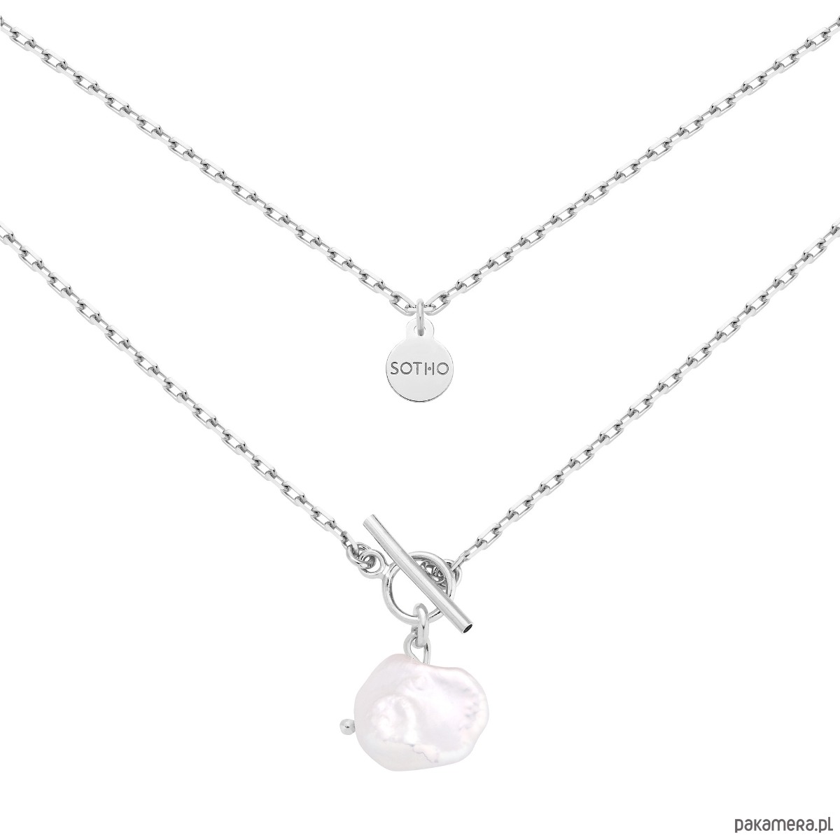 Srebrny naszyjnik z ozdobnym zapięciem i naturalna słodkowodną perłą i zawieszką z logo marki. Całość wykonana ze srebra 925.