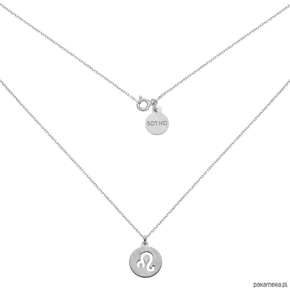 Srebrny matowy naszyjnik łańcuszkowy zdobiony znakiem zodiaku Lwa i zawieszką z logo marki. Całość wykonana ze srebra 925.
