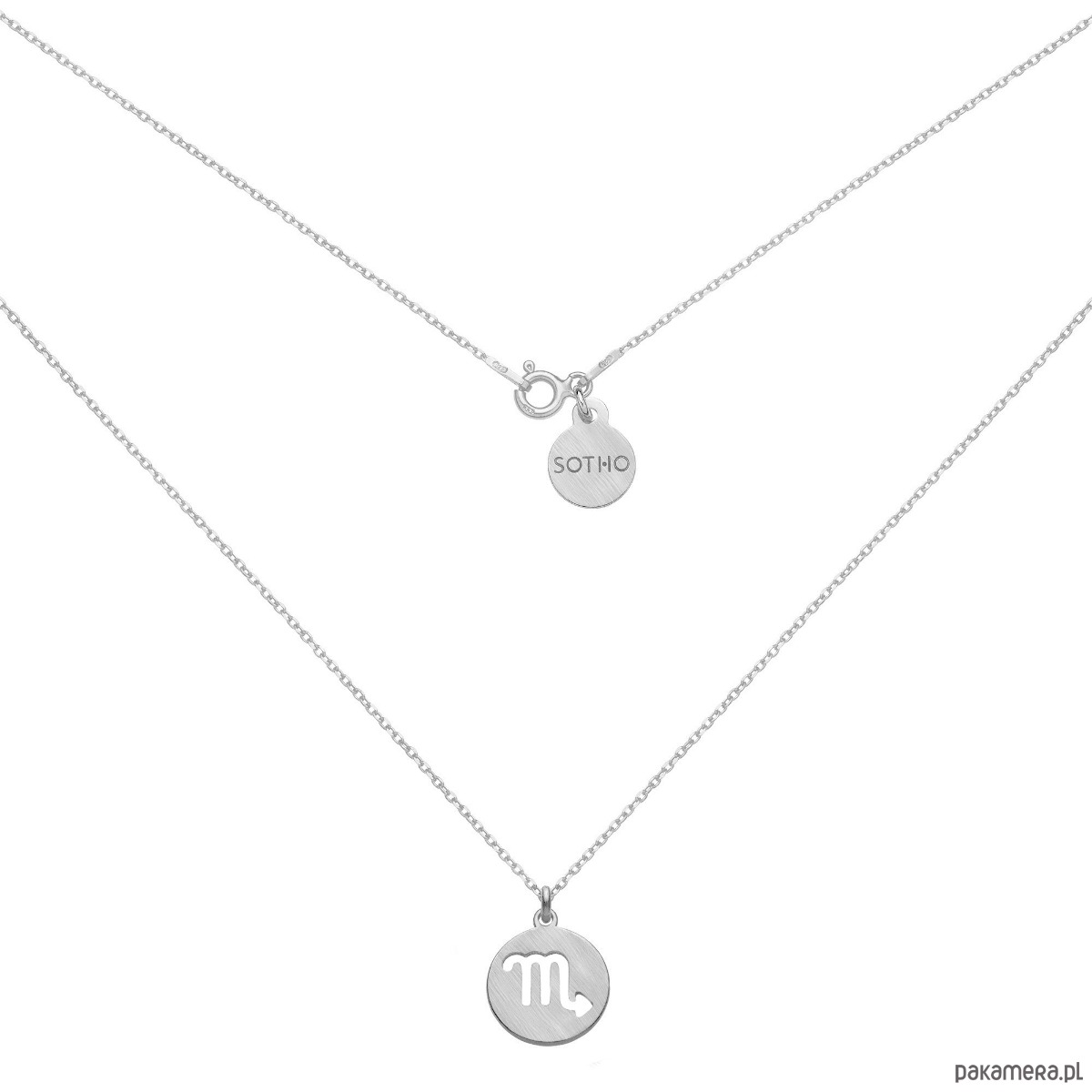 Srebrny matowy naszyjnik łańcuszkowy zdobiony znakiem zodiaku Skorpion i zawieszką z logo marki. Całość wykonana ze srebra 925.