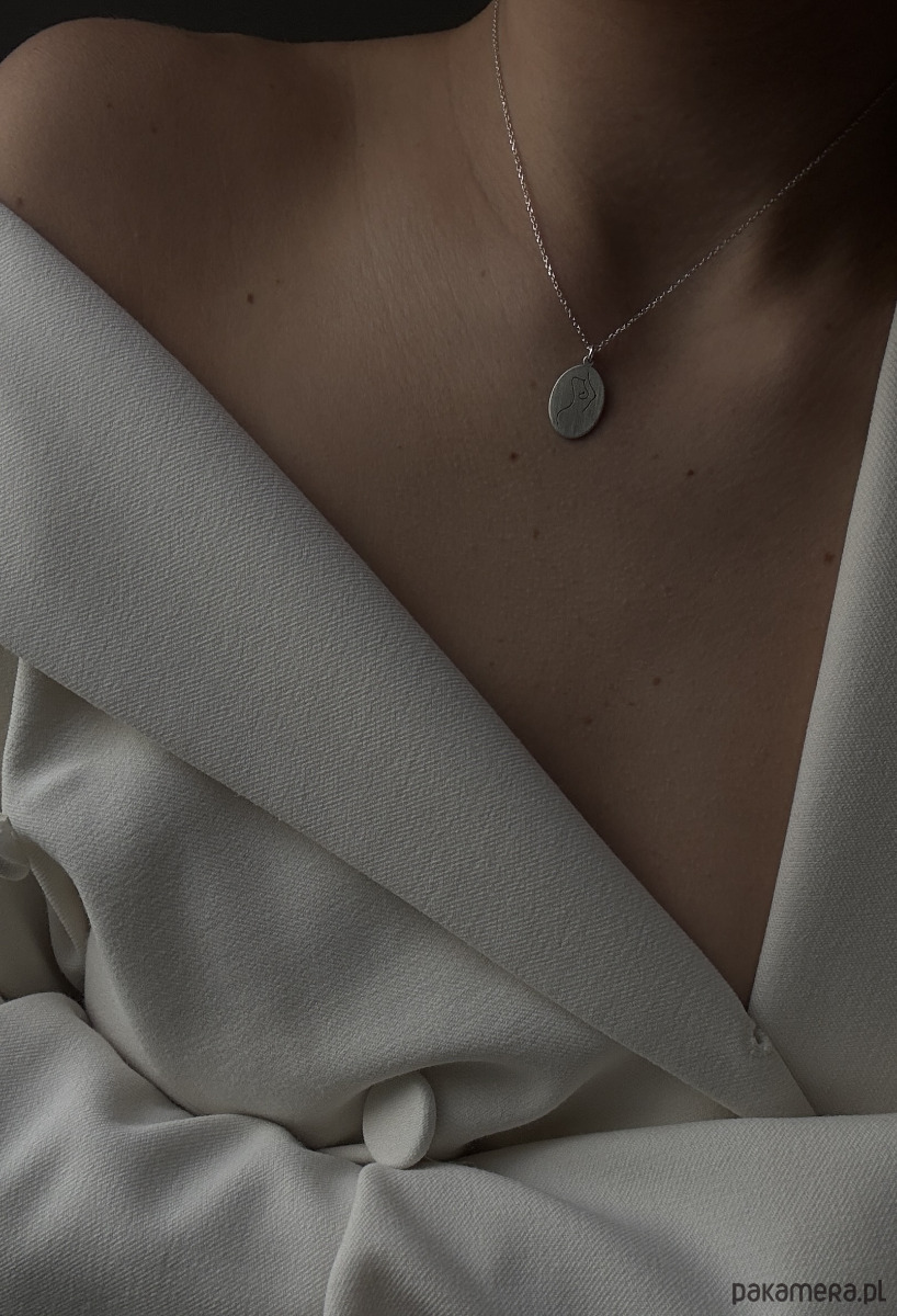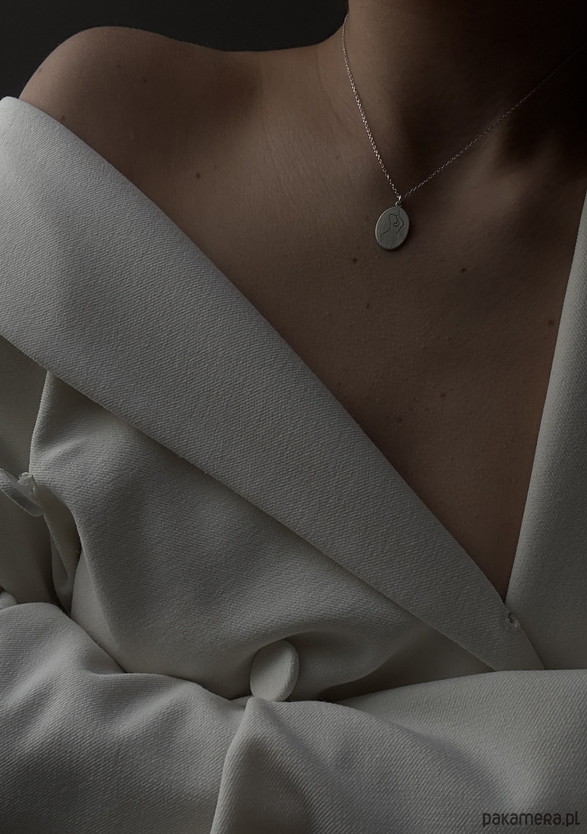 Srebrny naszyjnik z matowym medalionem Body N°5 i zawieszką z logo marki. Całość wykonana ze srebra 925.