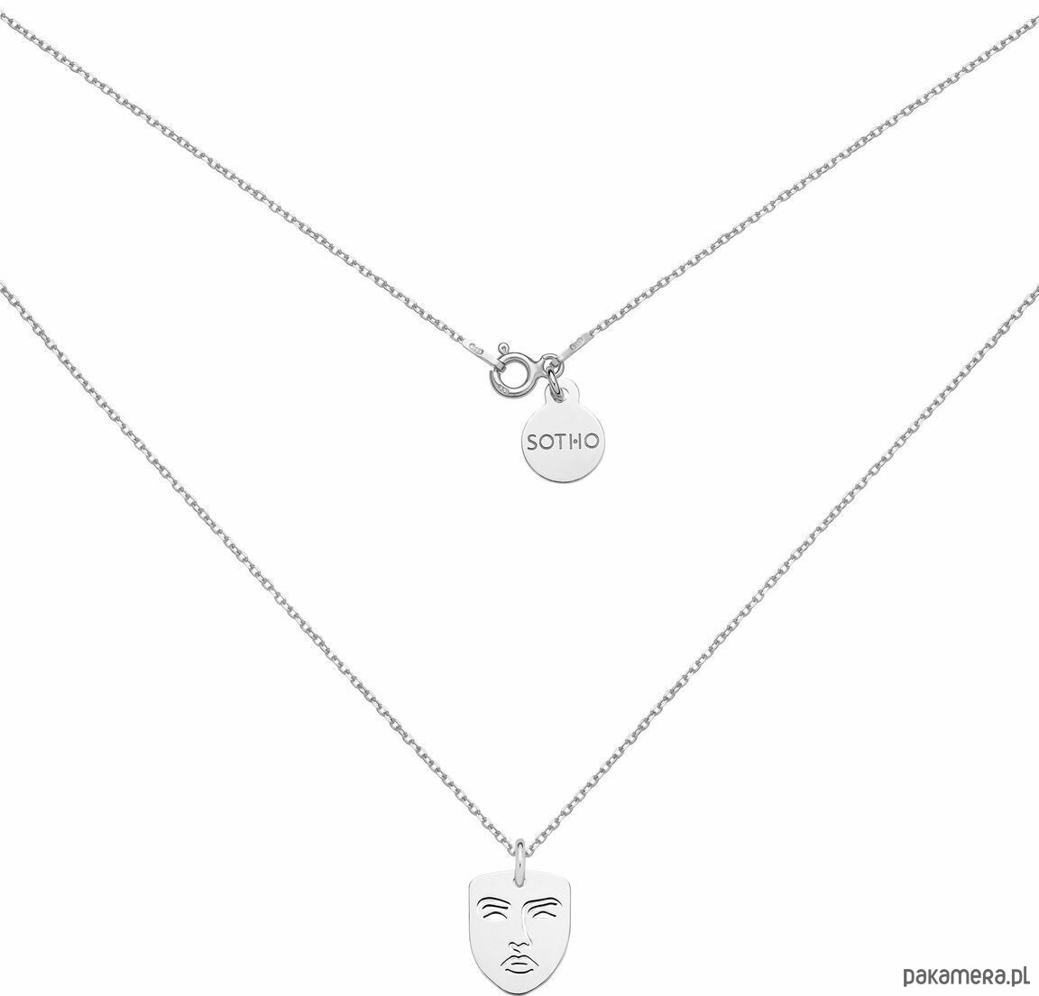 Srebrny naszyjnik z medalionem Face N°5 i zawieszką z logo marki. Całość wykonana ze srebra 925.