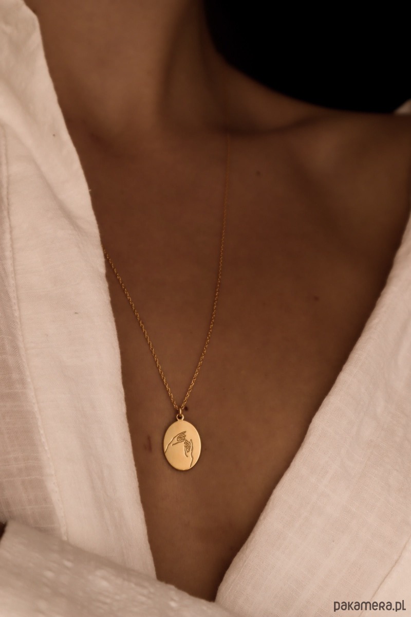Srebrny naszyjnik z medalionem z dłońmi oraz zawieszką z logo marki. Całość wykonana ze srebra 925.