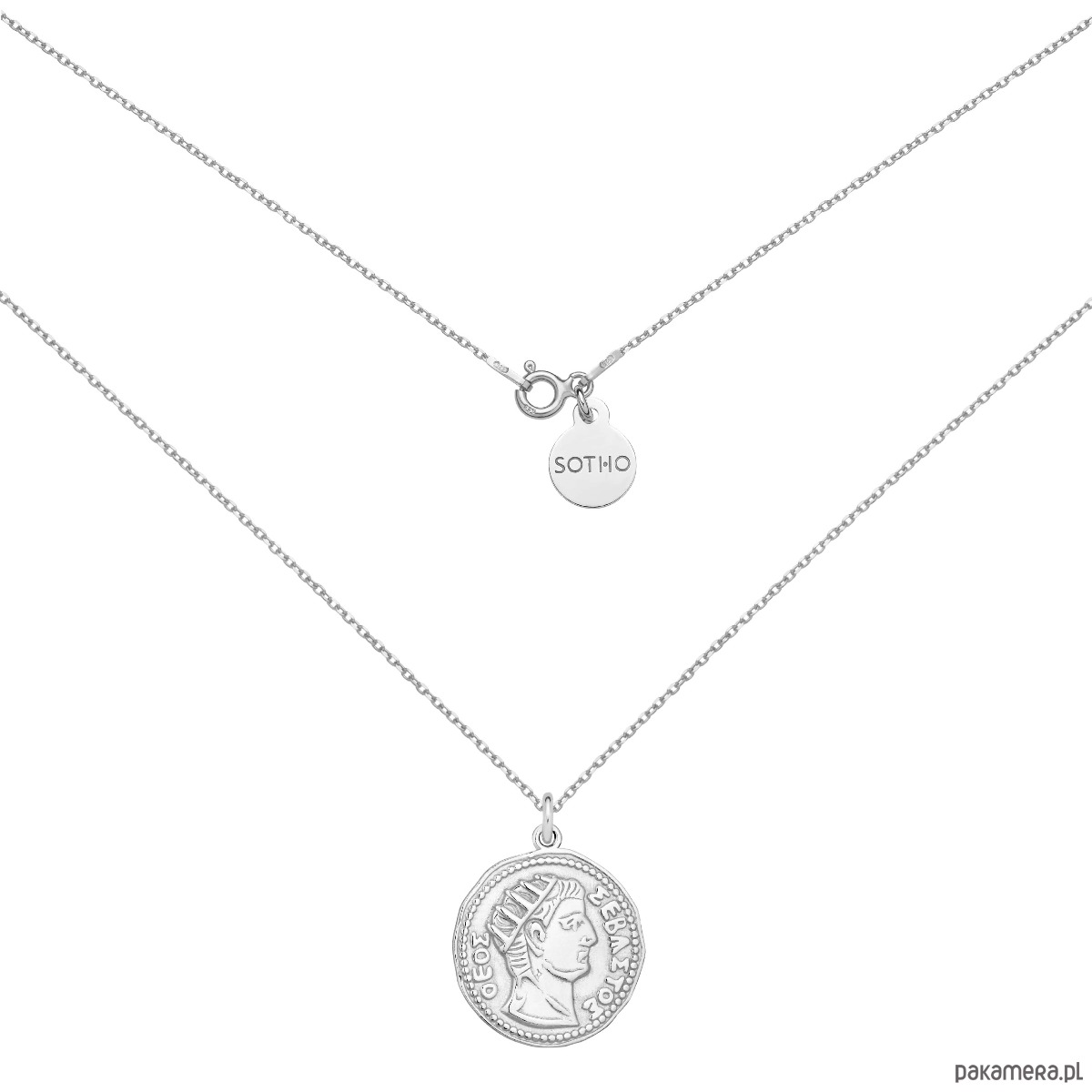 Srebrny naszyjnik ze starą monetą i zawieszką z logo marki. Całość wykonana ze srebra 925.